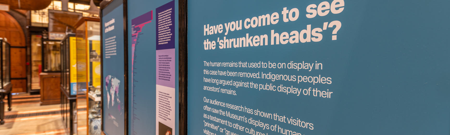 Indigenous peoples have long argued against public display of their ancestors’ remains. In July 2020 the Museum decided to remove all human remains from its galleries. To date 123 items have been removed. However, it is likely that as further research is done and as conversations with community groups progress, other items may be found to include human remains and these too may be removed.