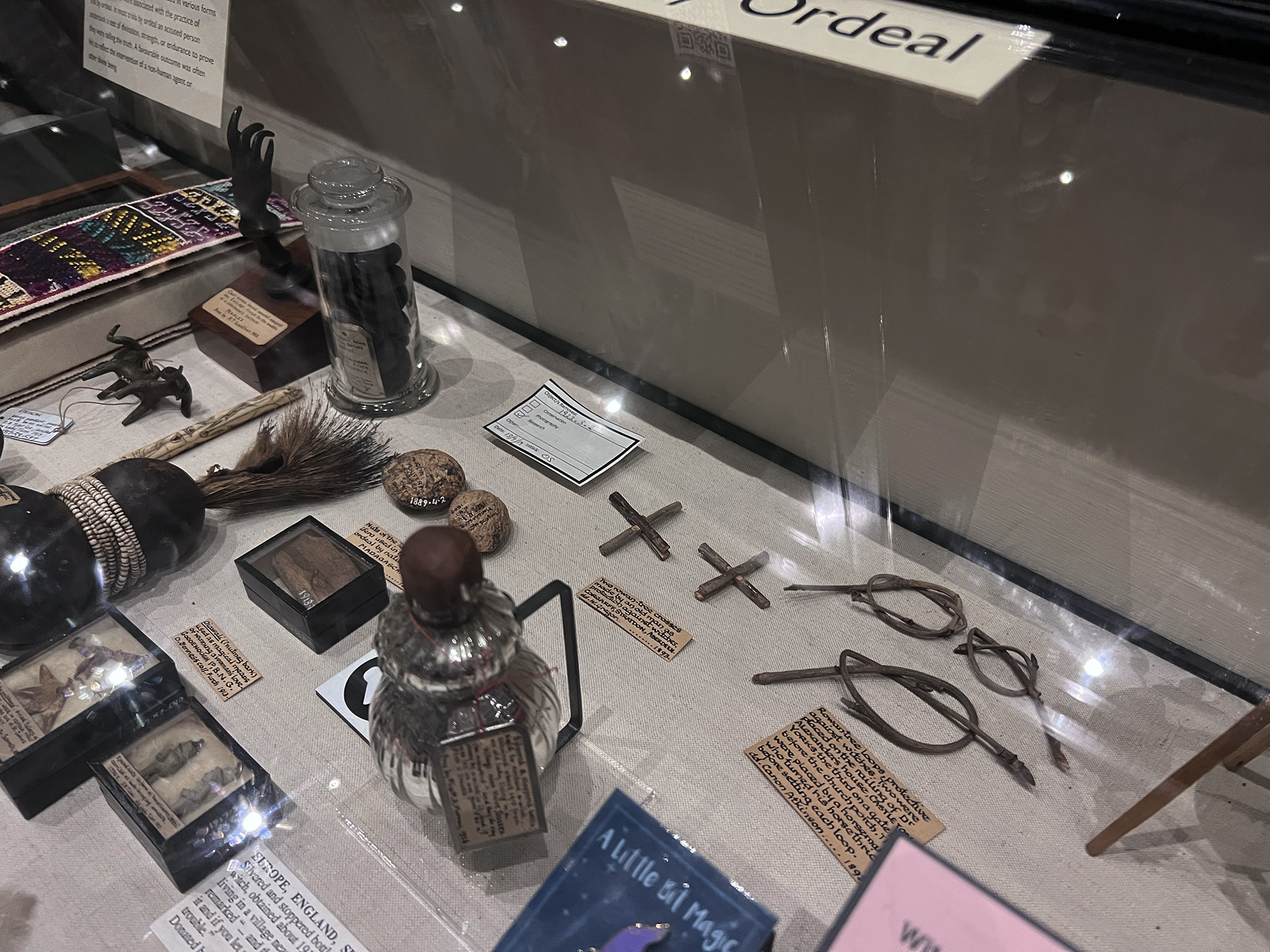 Rowan crosses are sometimes known as ‘Bride’s Crosses’ and were also said to have been tied to animals and carried in pockets as amulets as well. In 1597, King James VI of Scotland condemned their use in his compendium on witchcraft, the Daemonologie, which was republished in England in 1603. These examples were acquired by the Pitt Rivers Museum towards the end of the nineteenth century. There is still an active trade in rowan crosses, with modern examples being made and used today.