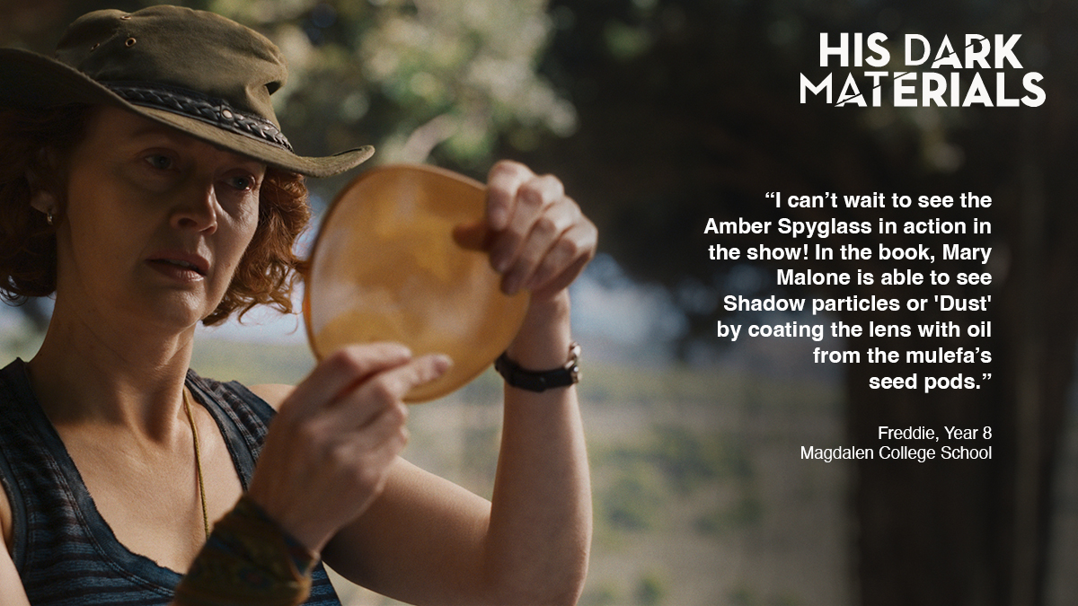 I can’t wait to see the Amber Spyglass in action in the show! In the book, Mary Malone is able to see Shadow particles or 'Dust' by coating the lens with oil from the mulefa’s seed pods.