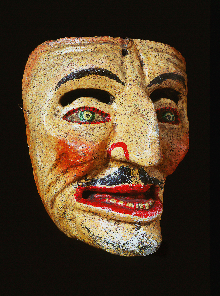 This carved dance mask is a particular type in which foreigners are represented as caricatures in secular dance performances.