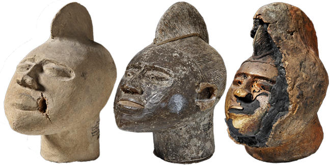 First, a clay or plaster model (‘core’) of the object (pictured left) is covered in wax (centre). A second layer of clay is applied over the wax with ducts for drainage, then the piece is heated so that the wax melts away leaving a cavity that can be filled with molten metal. Once the metal has cooled and hardened, the clay is chipped away (right) to reveal the metal object. These objects were donated by Robert Sutherland Rattray in 1910.