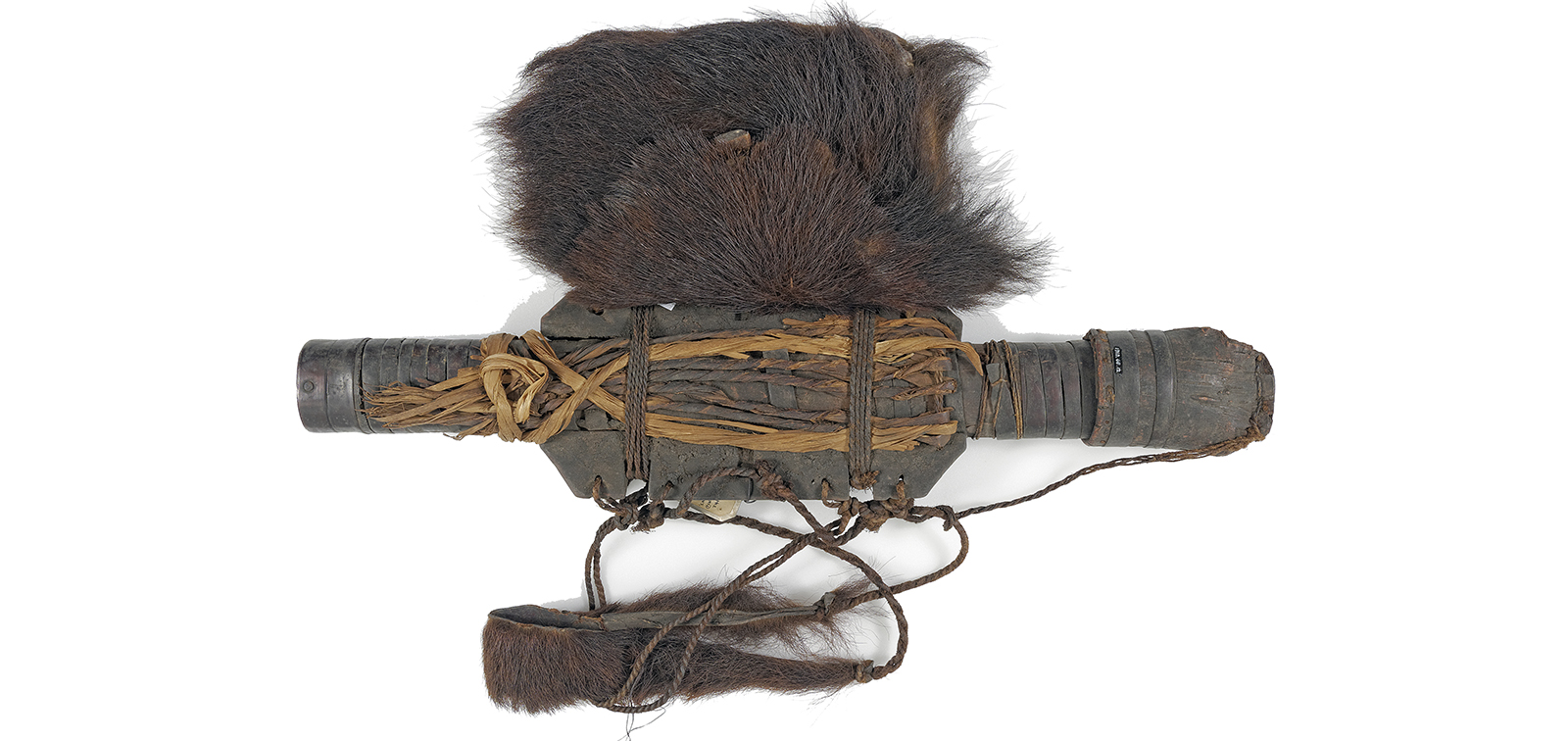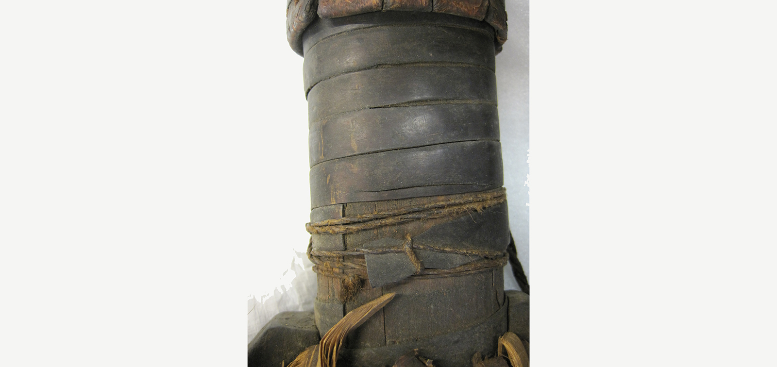 During an assessment in the conservation department, the team noted that the object had numerous signs of wear and repair which suggested its long-term use, such as repairs to the torn bearskin shoulder strap. Most curious of all was a dark-coloured encrustation of soot covering a large part of the object's surface and the two distinct layers of willow shavings wrapped around the quiver: a soot-covered under layer and a fresher upper layer. Such willow shavings are considered to have been inau, a term to describe something used as a channel between spirits and people in Ainu cultural practice.