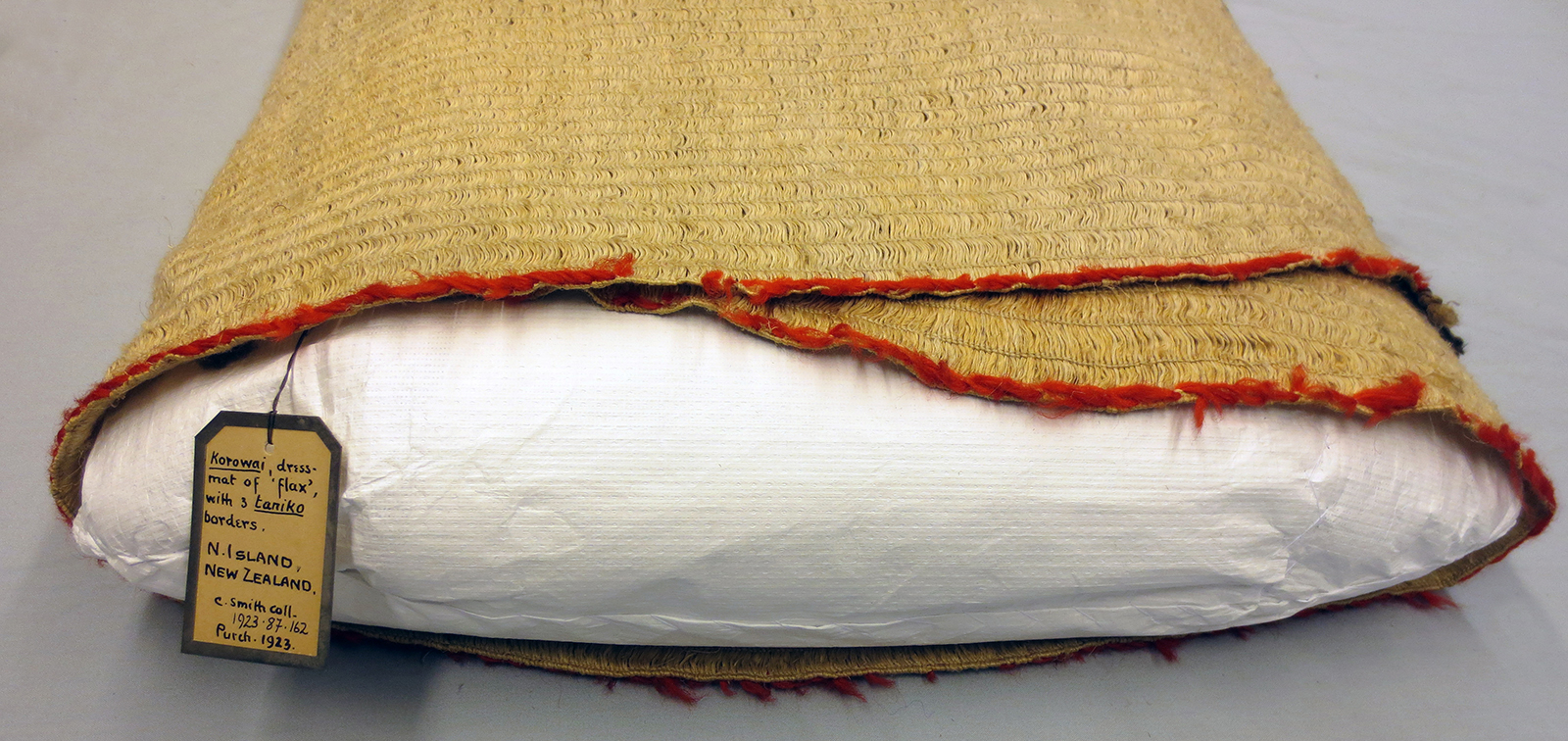 Many objects in the Museum collections are currently not on display. A key role of the conservation team is to ensure objects in storage are cared for and stored appropriately to preserve them and make them accessible for future research. The preservation of an object can be greatly enhanced by a suitable storage solution. This aspect of conservation can be demonstrated by the surveying and rehousing of a number of the Māori cloaks (kākahu) within the collection.