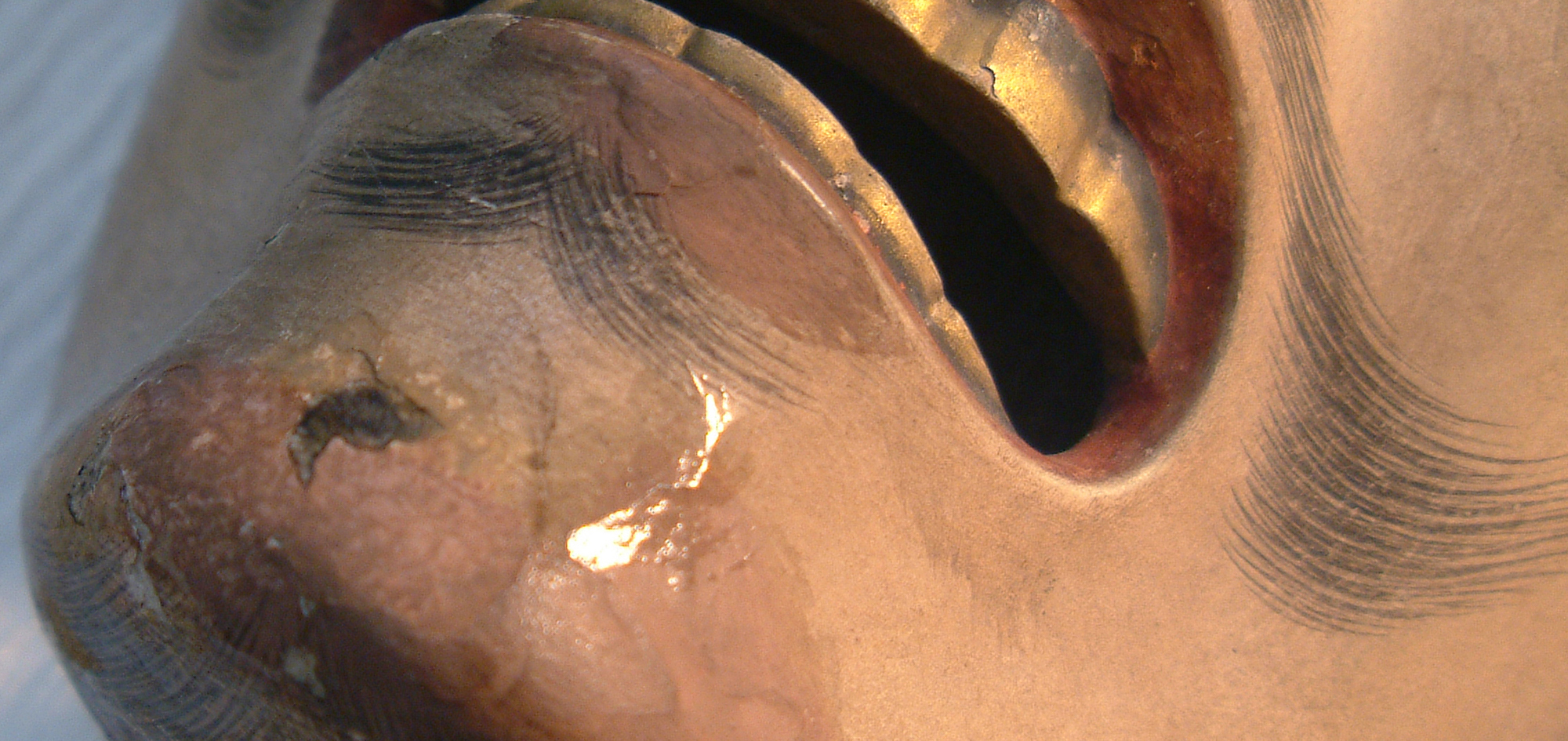 Many of the masks had suffered from shrinkage of the wood resulting in cracking and loss to the gofun top layer. The most common areas of damage were the sides containing holes for the ties that would have secured the mask to the face; the top of the head and chin where it would have been held; and the tip of the nose, where it had been laid face down on a hard surface.