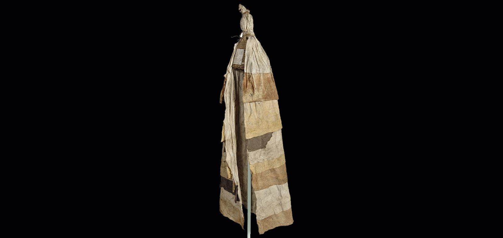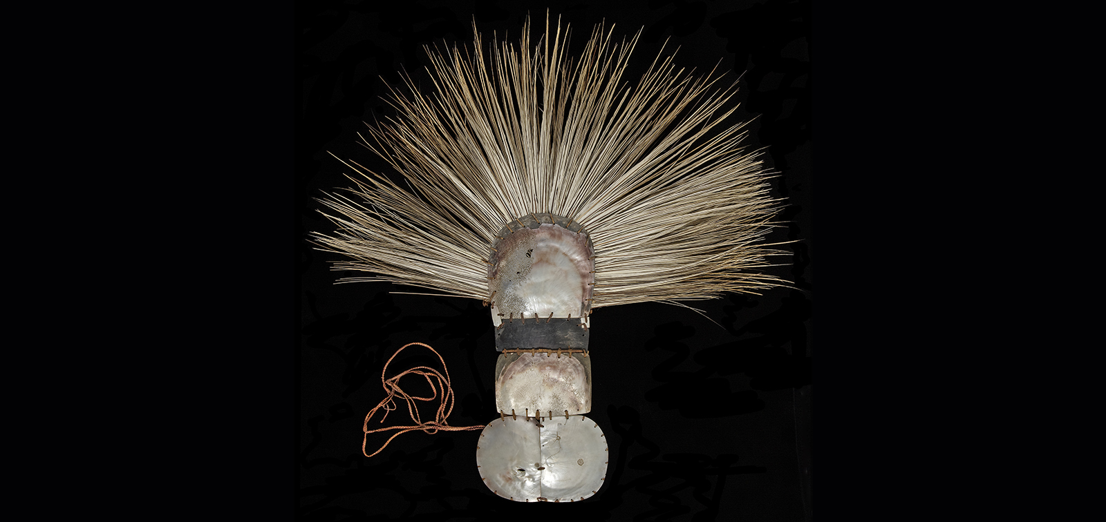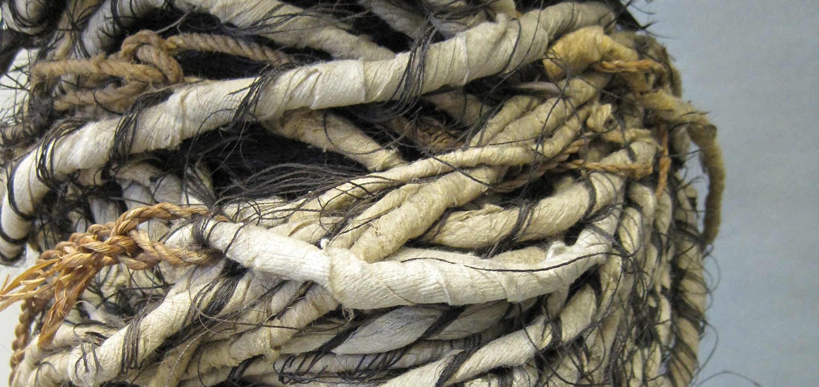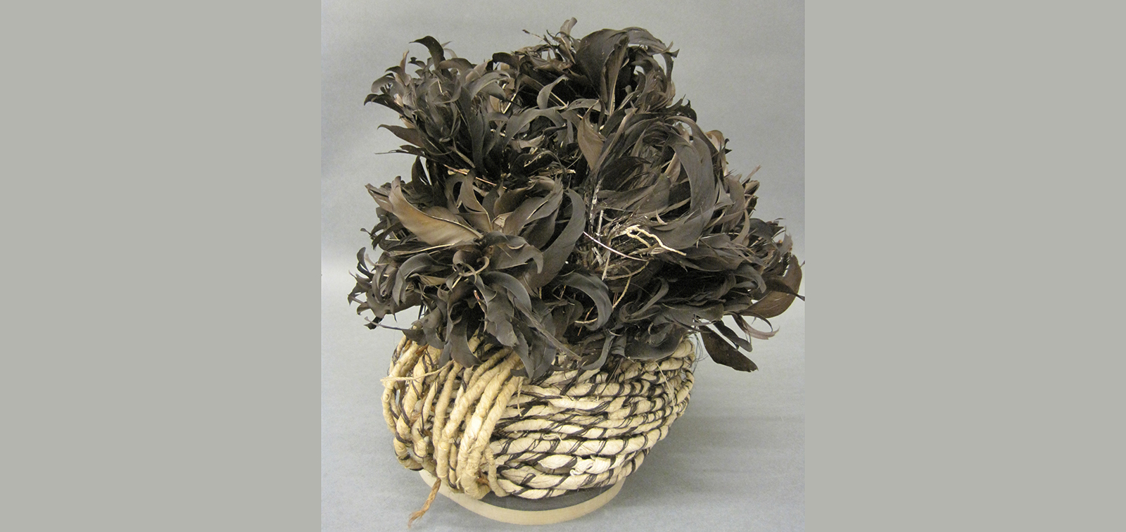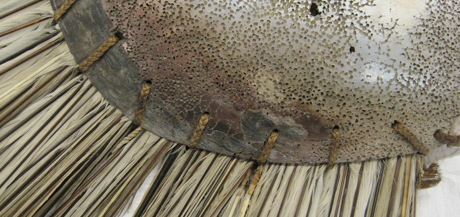 The bindings of the headdress are made from many metres of coconut fibre cord wrapped in barkcloth and wound with several strands of plaited hair. Hair was an important component of the Chief Mourner's costume, as the head is very tapu (sacred) in Polynesian culture. Due to past insect infestations, the strands of braided hair had been eaten through in many places, cutting the strands into much shorter lengths, which had come unwound from the bindings.