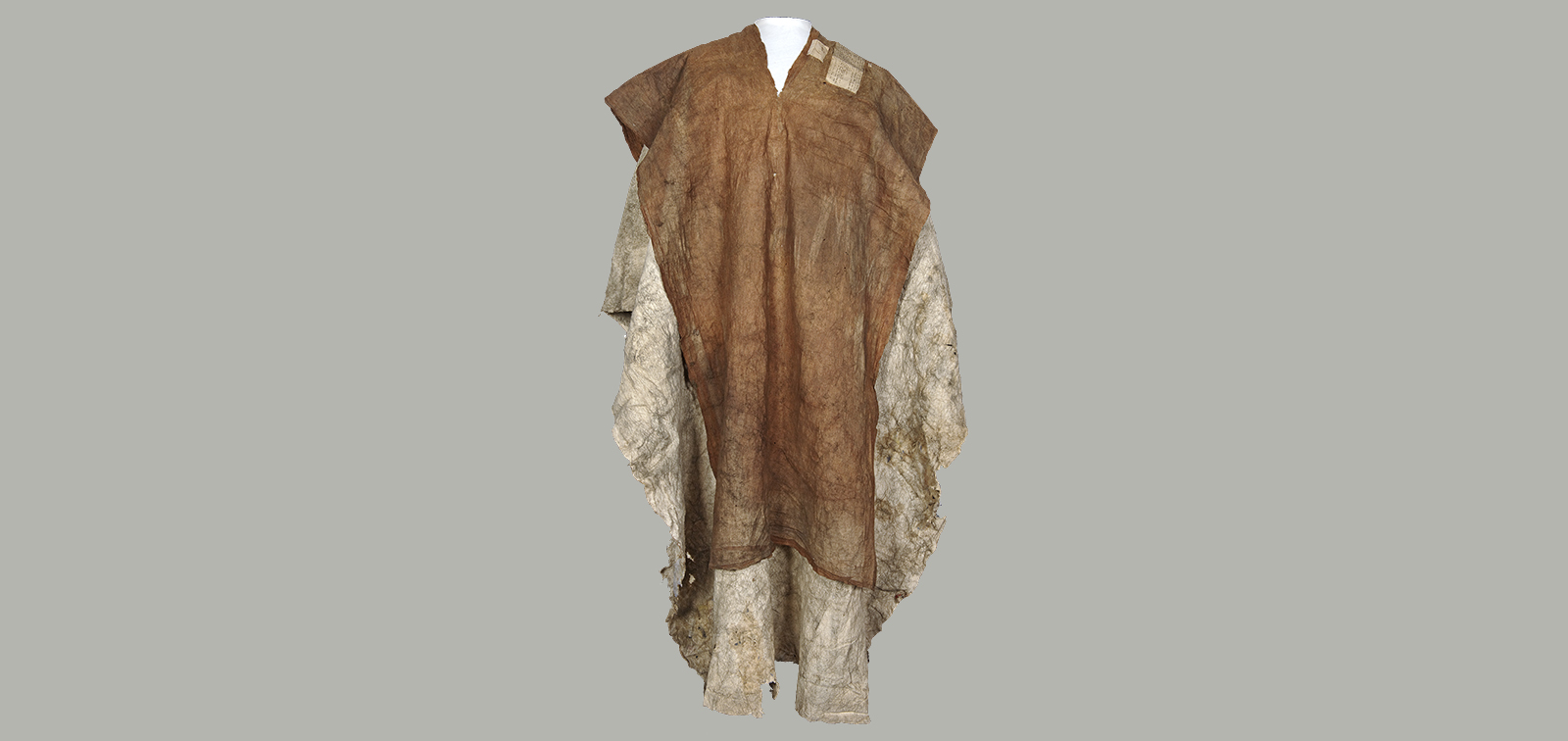 Much of the rest of the costume is made from barkcloth, in various forms. Barkcloth was made by beating out the bark of various kinds of tree, such as the paper mulberry, until it was thin and flexible. The barkcloth was torn in many places, partly because the mount on which the costume was displayed for many years did not support the costume properly. Previous attempts to reinforce the damaged areas involved stitching nylon netting over the tears. These repairs were not sympathetic to the paper-like nature of barkcloth, and were removed. The old repairs were replaced with small strips of Japanese tissue, a handmade paper with long fibres giving strength, which were adhered over the torn areas using a starch paste adhesive.
