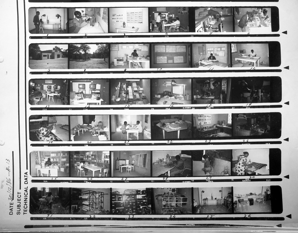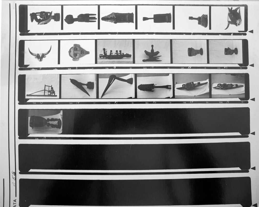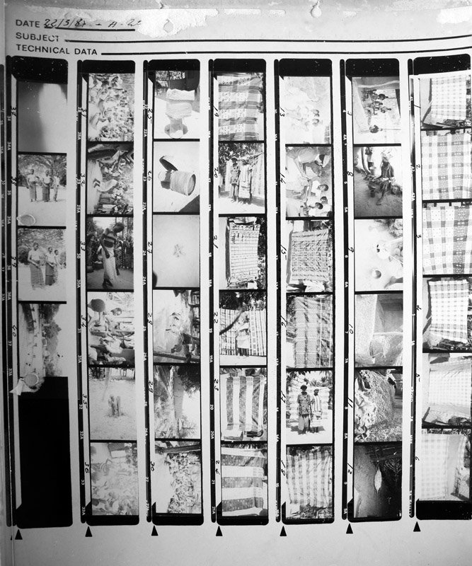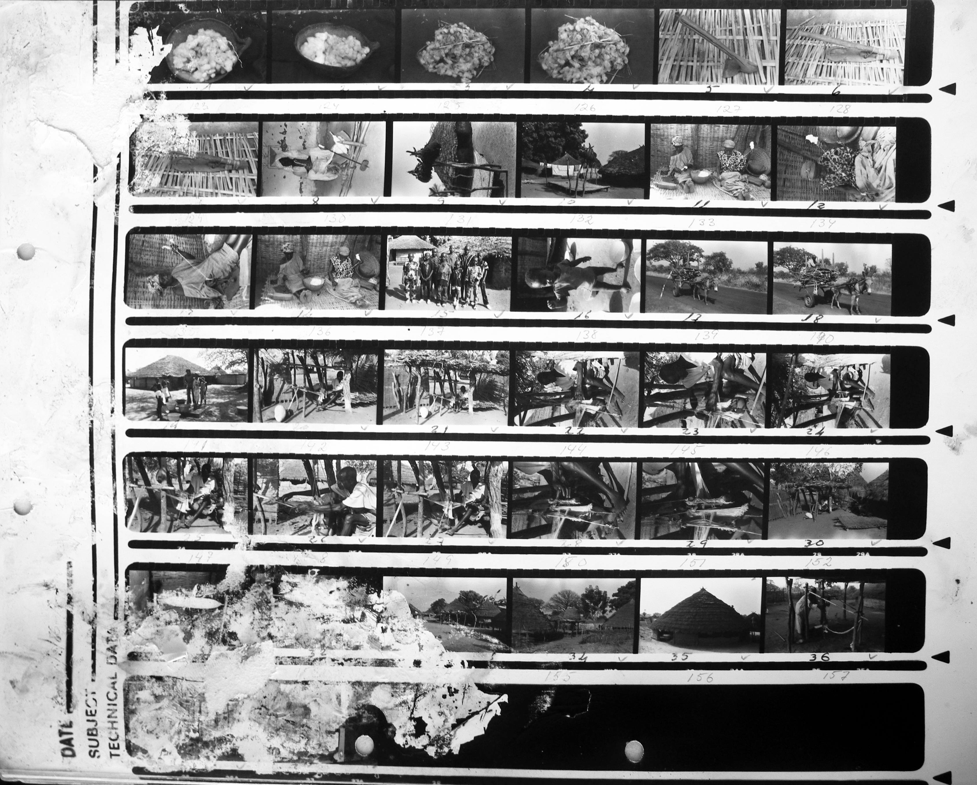 The contact prints that survived depict the Museum’s various interests and past displays, photographs of its objects, fieldwork photographs showing objects being used, as well as members of local communities. Thematic displays included local architecture, arts and craft, performances, and food production. Developed as quick reference prints, many of the contact print sheets are worn and punched with holes for filing. Connections between the small rows of images can be seen on closer inspection, helping to weave together the Museum’s history.
