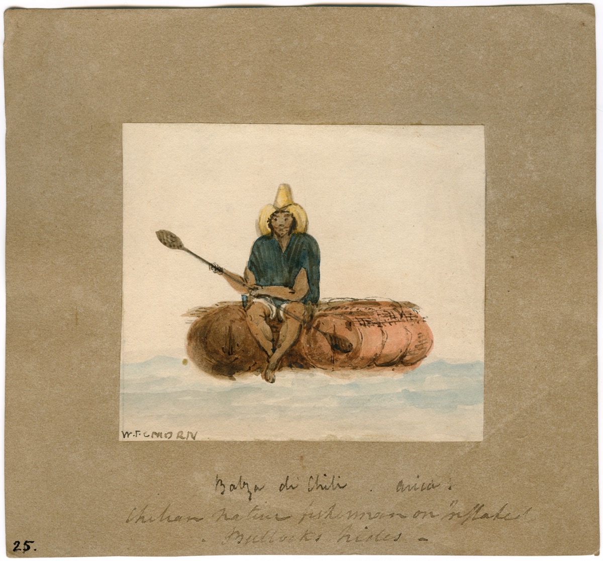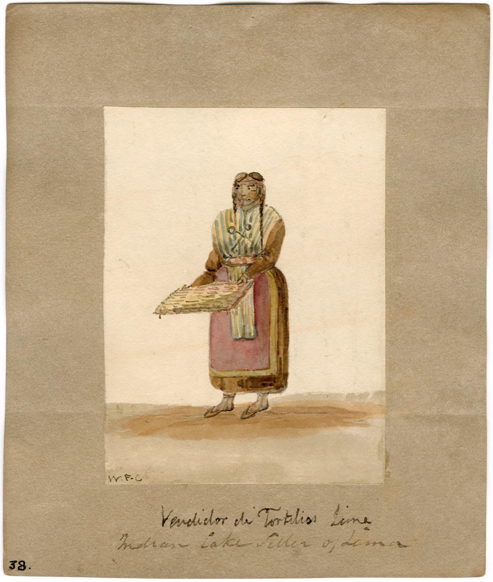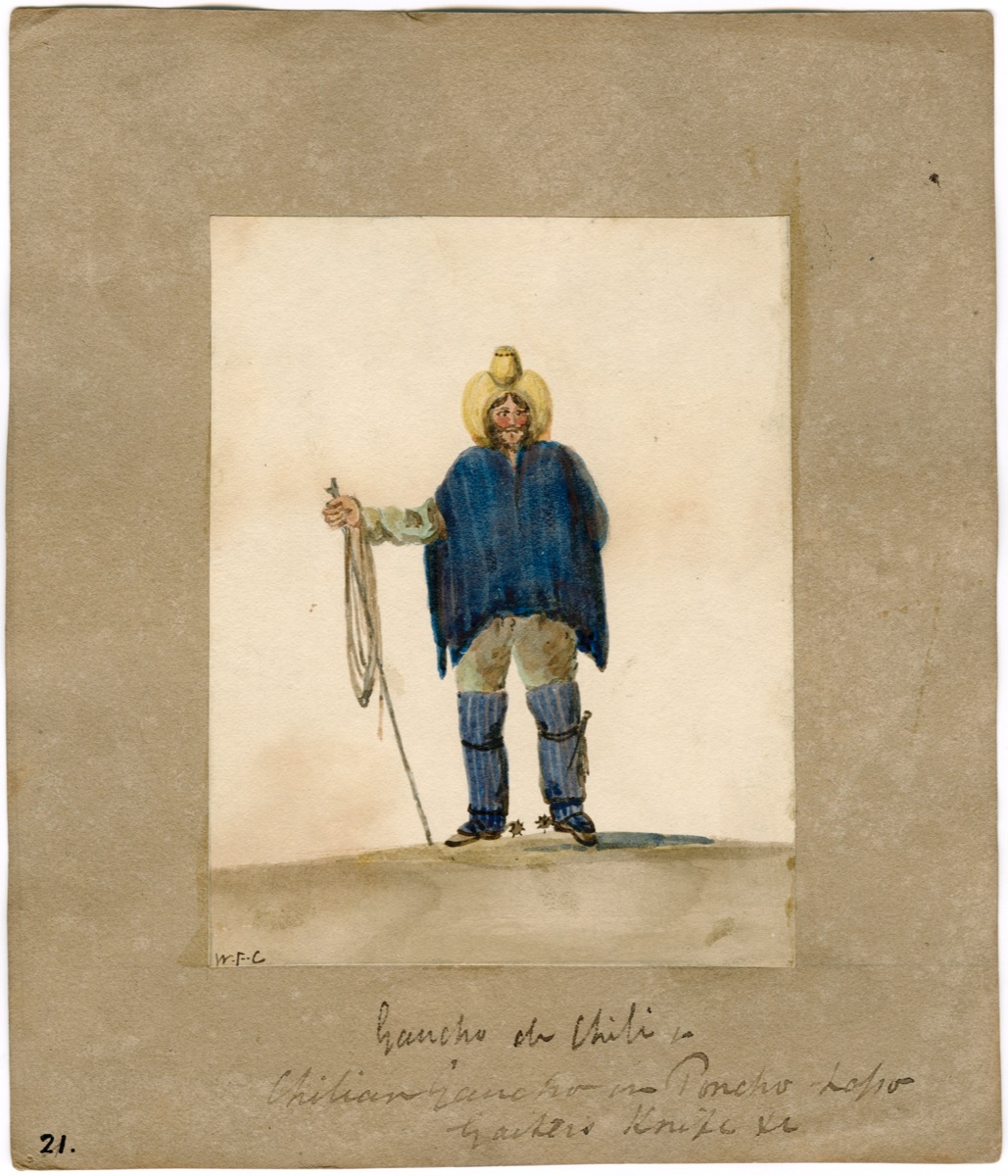 The ship’s officers made excursions overland to Lima in Peru, Santiago in Chile, and elsewhere. Carter would have had ample opportunity during these excursions to acquire a collection of costumbrismo. His watercolours, however, appear to be his own versions of such paintings: some perhaps inspired by – if not copied from – examples belonging to his fellow voyagers or from illustrations in books, others perhaps painted from life or at least informed by his own observations.