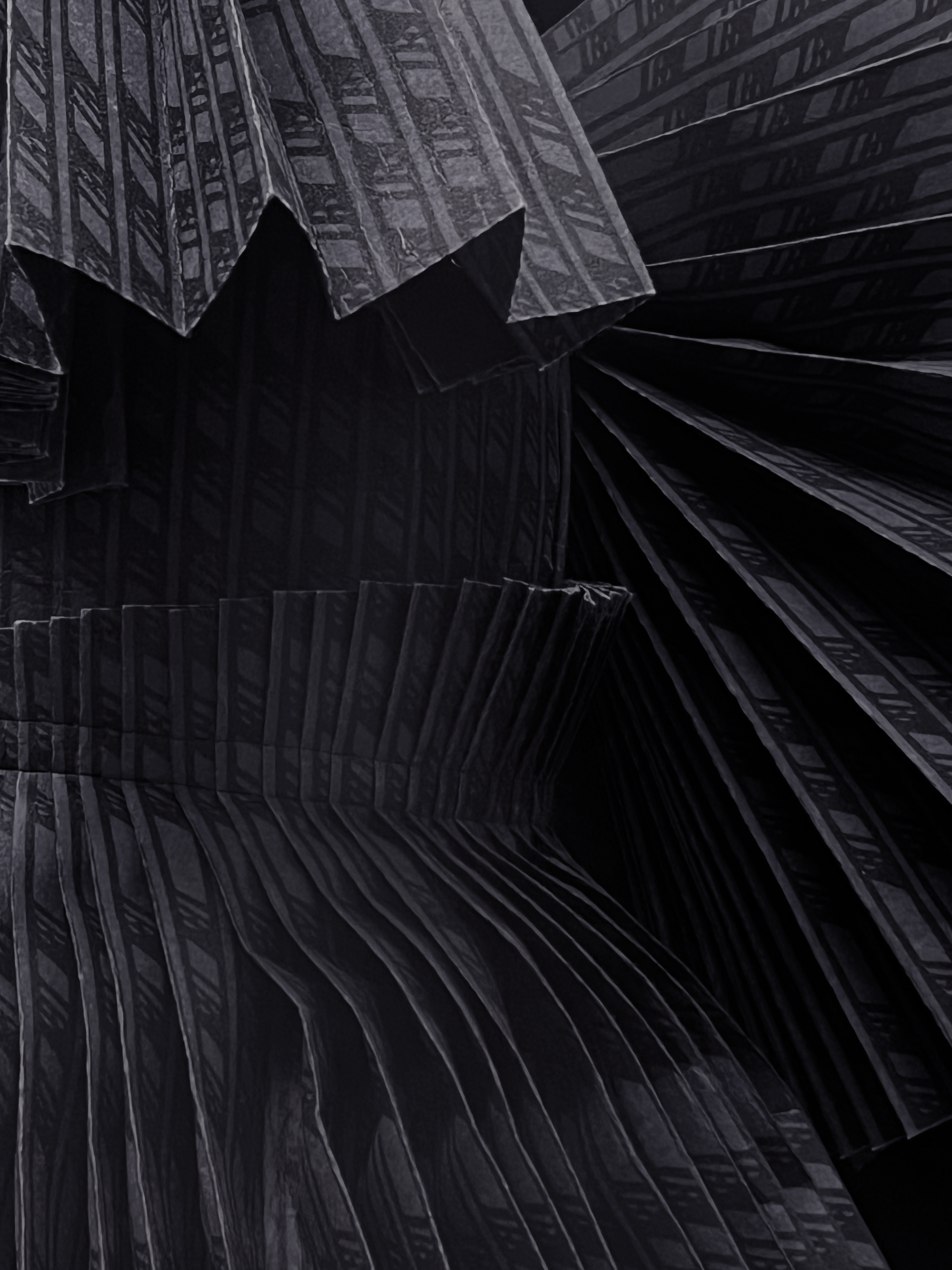 The pattern on the dress is created through a practice called ohe kāpala, a form of traditional bamboo stamping. These are made by carving intricate patterns into bamboo sticks. Each pattern represents a repetition design found in nature. Repetition is important because it represents the rituals, the practices, the hours of sacrifice that artisans make to be able to create.