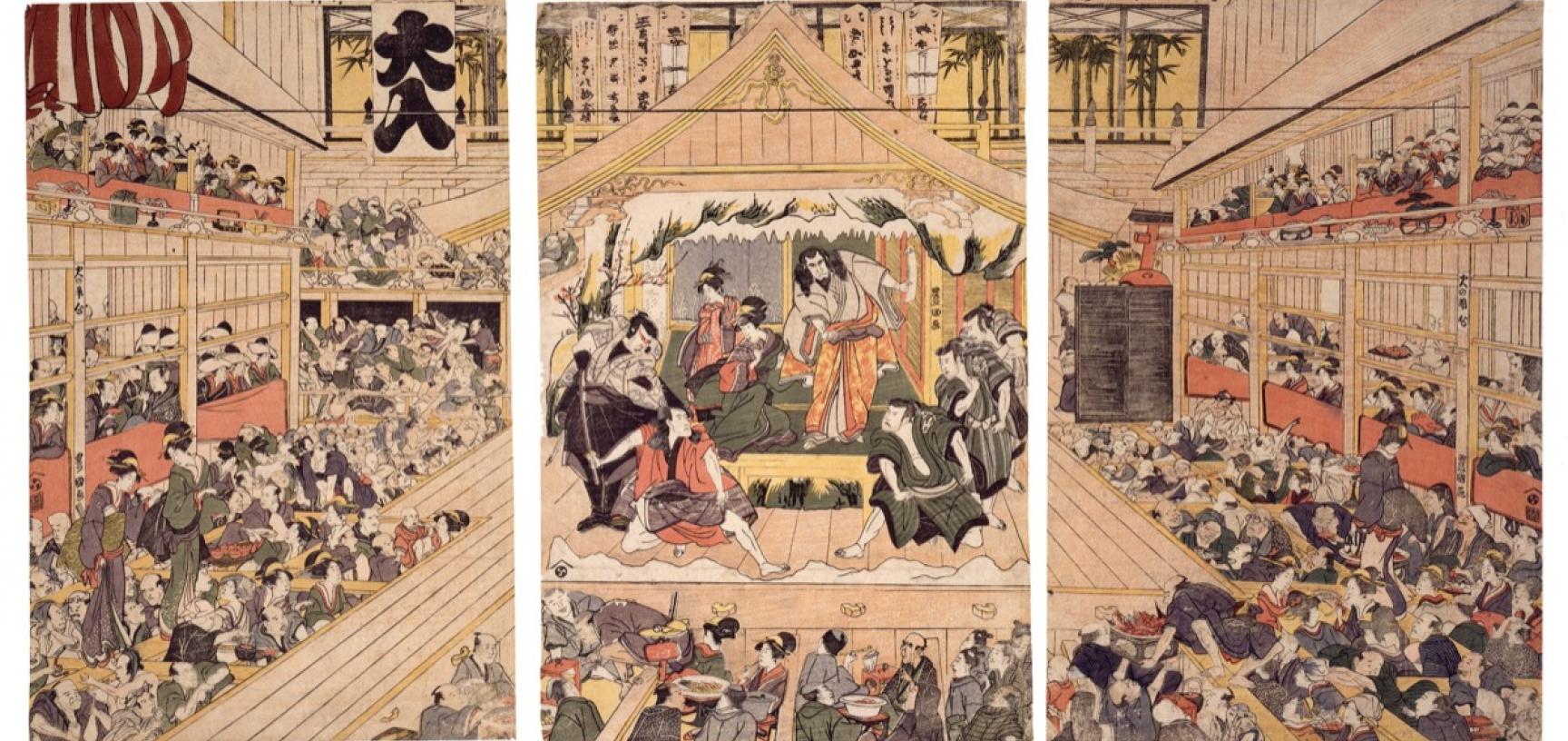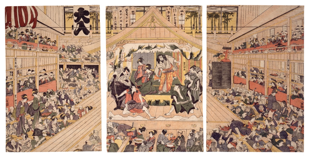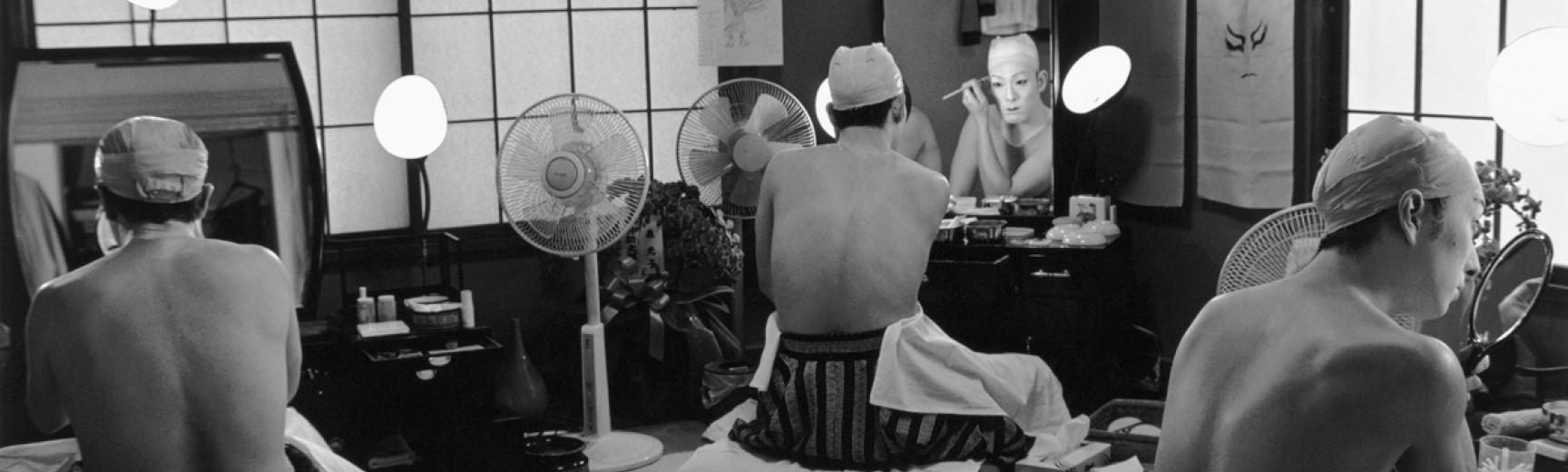 In the first section of the exhibition the viewer was transported to a world rarely witnessed by outsiders, dimly lit and governed by ancient traditions and routine. Here we see the actors as they dress and apply thick make-up (kumadori), have wigs fitted, rehearse their lines and practise final dance steps, preparing to take the stage. Thereafter, when the curtain is raised, we see the same male actors performing, sometimes in spectacular central roles as women (onnagata), in historic plays such as Hokaibō and Natsu Matsuri Naniwa Kagami (Summer Festival: A Mirror of Osaka).