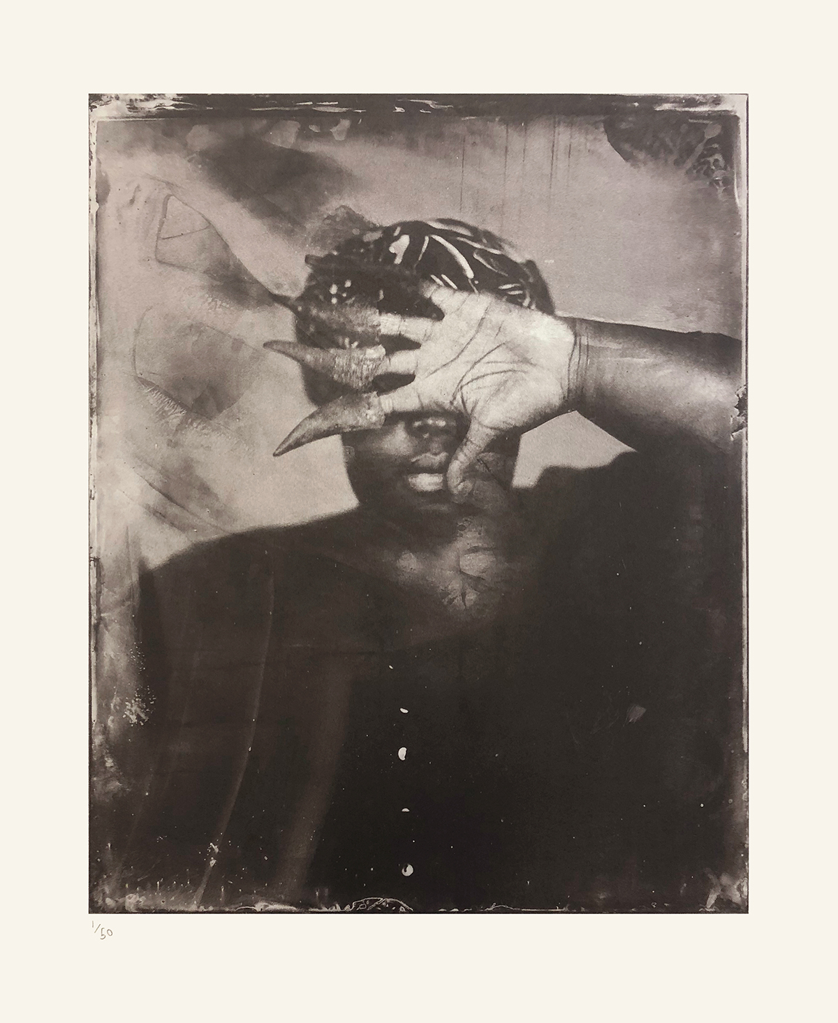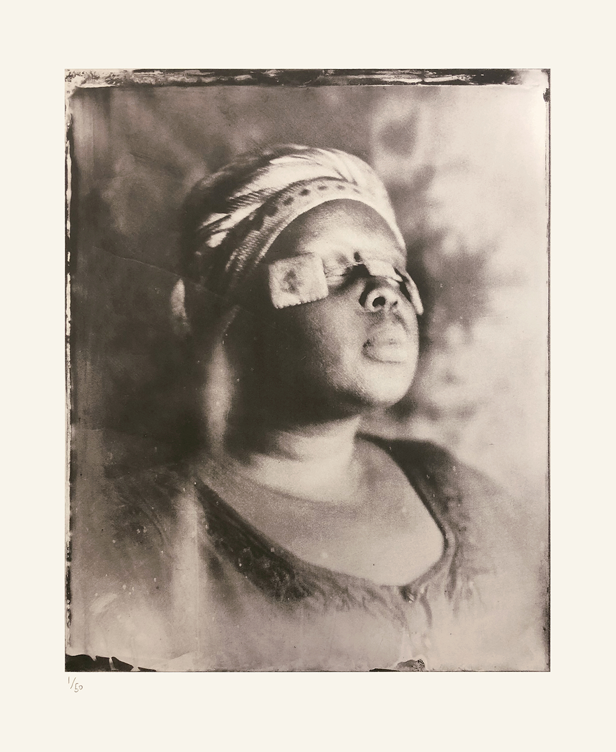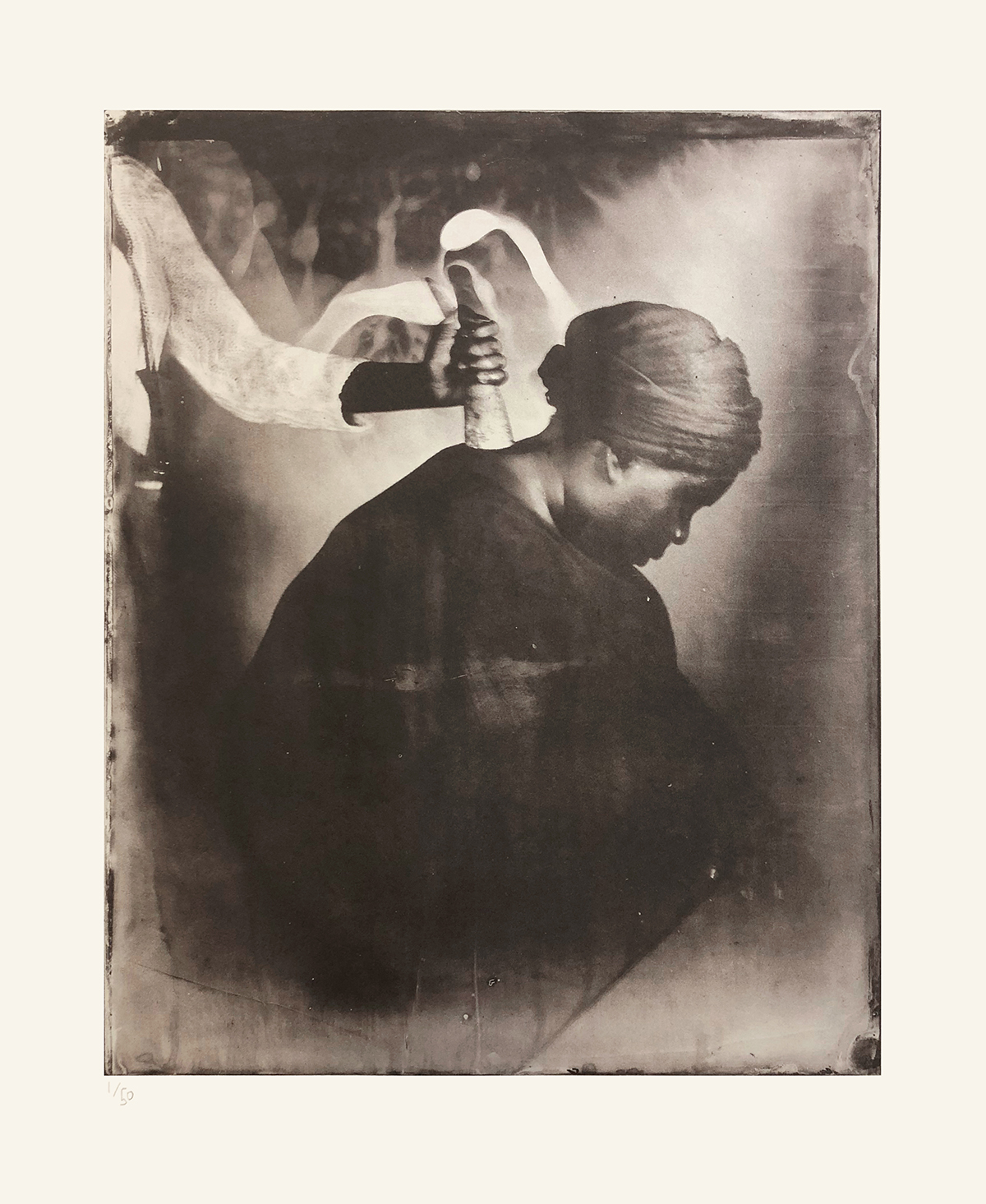 Whilst exploring the notions of Gambian rituals, the process of image making became a ritual in itself. The journey of making wet plate collodion tintypes is unique; no image can be replicated and the final outcome is beyond the creator’s control. Within this process, you surrender yourself to the unknown, similar to what is required by all spiritual higher powers: surrendering and sacrifice. Each tintype has its own unique story to tell, a metaphor for our individual human spiritual journey. The process of submerging the collodion covered plate into a tank of silver nitrate ignites memories of baptisms, the idea of purity and how we cleanse in order to be spiritually sound. The application of the collodion transcends the photographic process; it is a reflection, a physical manifestation of the artist’s subconscious relationship to traditional African spirituality.