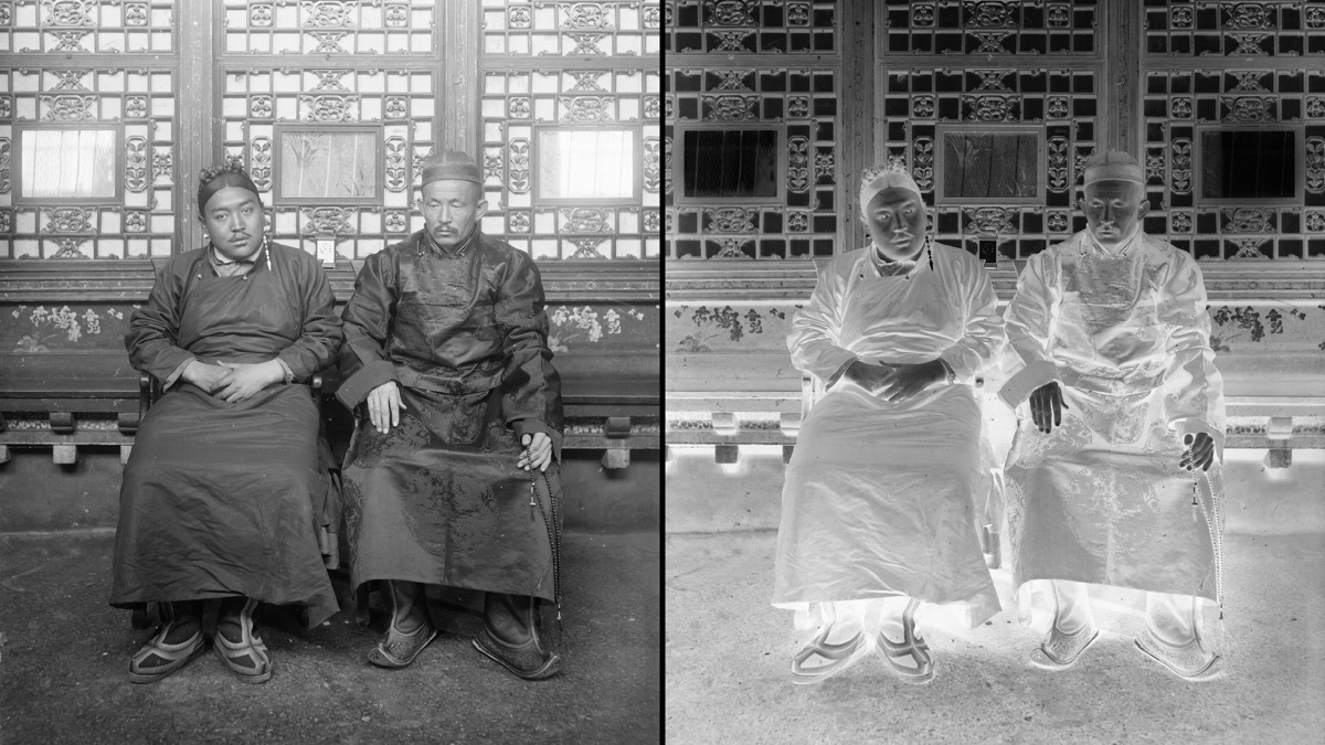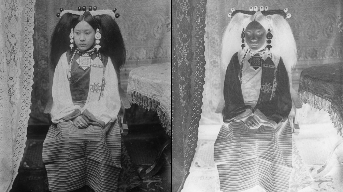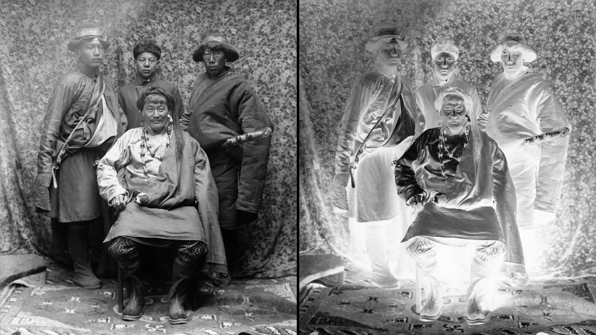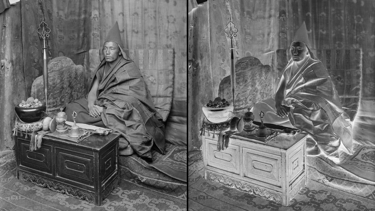 During her visits to the Pitt Rivers Museum, Nyema studied the museum’s collection of historic photographs of Tibet and created her own work in response to it. The collection features more than 5,000 photographs created by British visitors to Tibet in the first half of the twentieth century and includes many studies of Tibetans, often framed according to the mode of ‘ethnic type’ photography that was first formulated in anthropological photography in the nineteenth century. Among them are a set of glass plates portraying Tibetans living in Lhasa in the 1920s. Viewing the plates in both positive and negative formats was one of the inspirations behind the double portraits she subsequently created. When displayed in the museum, they articulate Nyema’s critical interaction with the representation of Tibet in British museums and seek to disrupt the stereotyping of Tibetans by non-Tibetan photographers in the past.