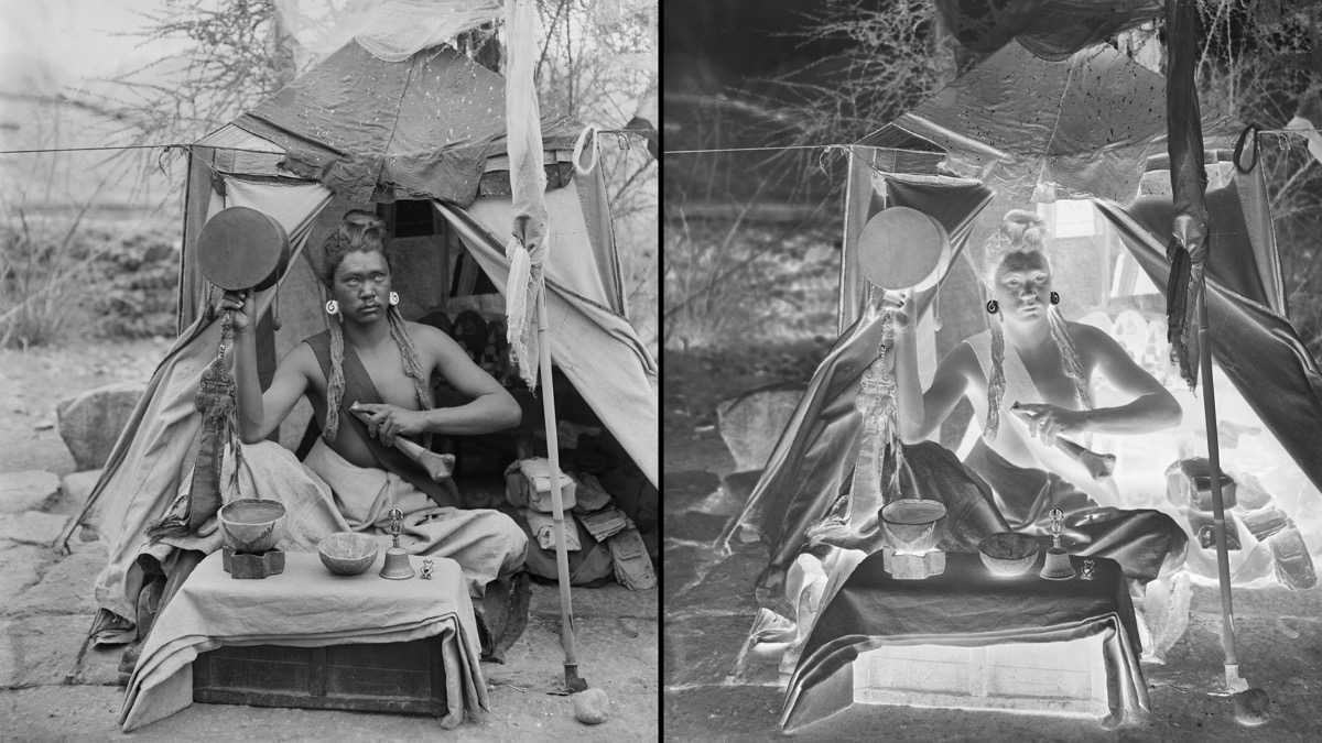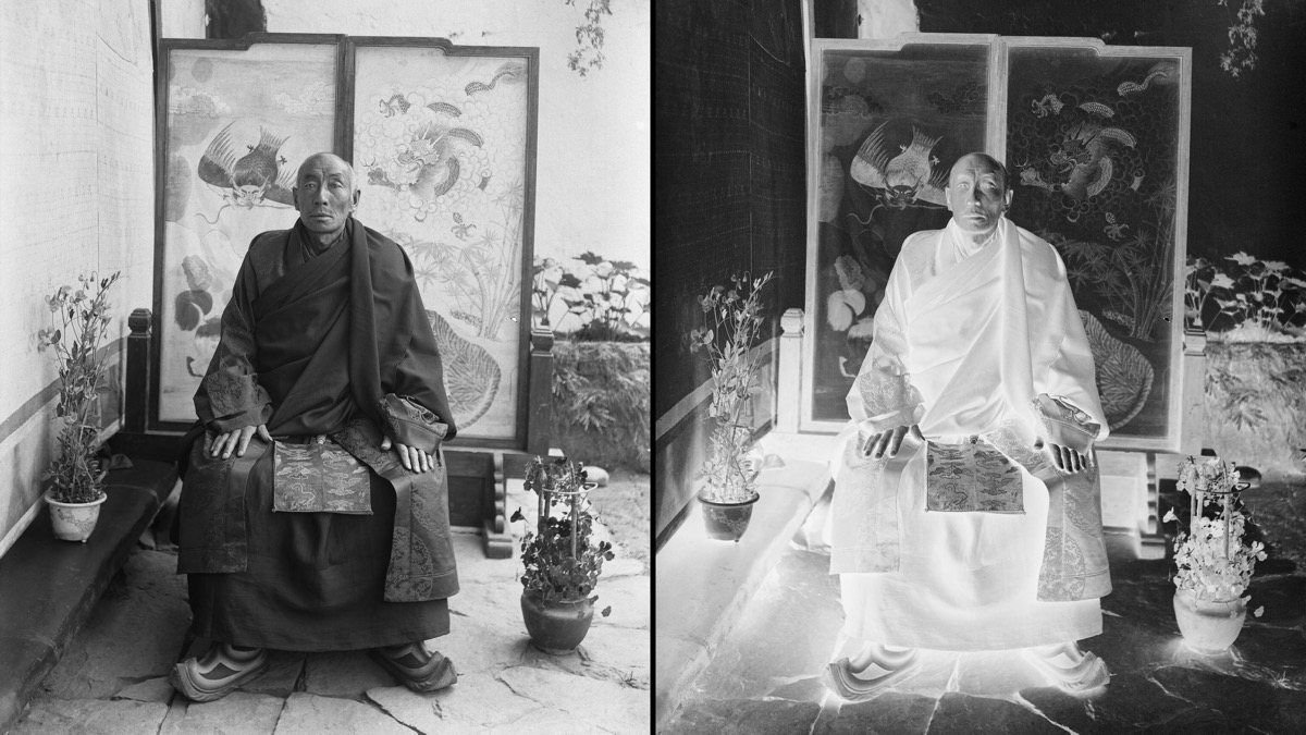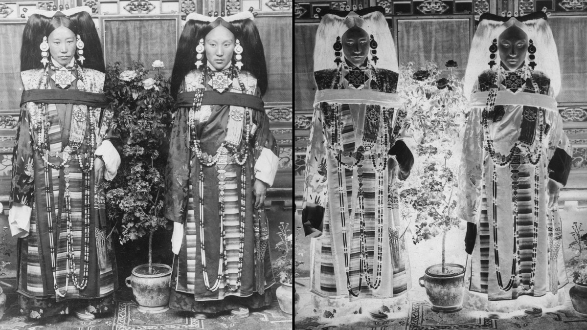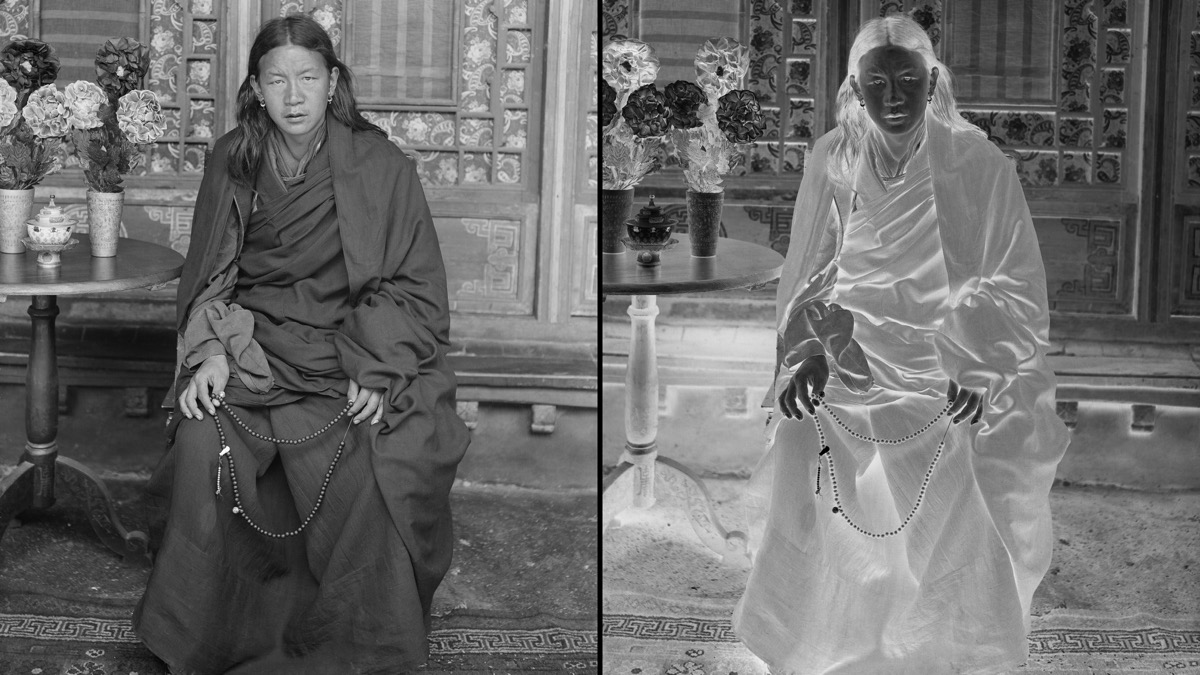 During her visits to the Pitt Rivers Museum, Nyema studied the museum’s collection of historic photographs of Tibet and created her own work in response to it. The collection features more than 5,000 photographs created by British visitors to Tibet in the first half of the twentieth century and includes many studies of Tibetans, often framed according to the mode of ‘ethnic type’ photography that was first formulated in anthropological photography in the nineteenth century. Among them are a set of glass plates portraying Tibetans living in Lhasa in the 1920s. Viewing the plates in both positive and negative formats was one of the inspirations behind the double portraits she subsequently created. When displayed in the museum, they articulate Nyema’s critical interaction with the representation of Tibet in British museums and seek to disrupt the stereotyping of Tibetans by non-Tibetan photographers in the past.