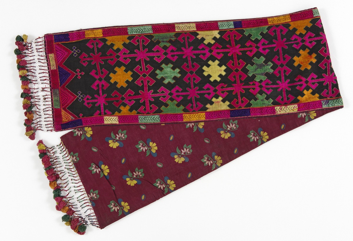 Armed with ‘five kilos of baggage and a litre of vodka’, in 1990 she set off for the Hindu Kush. She thought she might find tasselled triangles worn as amulets or stitched on to the clothing of women in the mountains of Kohistan … but which Kohistan? Travelling alone in increasingly dangerous territories, she was smuggled into Afghanistan by the Mujahideen, hidden under the folds of a burqa. This initial journey was followed by trips to Pakistan, India, Central Asia, Europe, and North Africa among others, all with the same aim in mind. Everywhere she went she worked closely with women, often isolated in their homes, and between them embroidery became a common language.