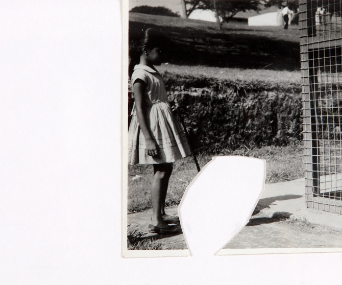 Redux (2018) is a new photo-montage installation shown in the glass display case. These are selected pages from a future book project, where actual family photographs, newspaper images of social and political events, features and advertising from 1972 are collaged against nostalgic landscape images of East Africa. The work seeks to disrupt common visual narratives and patterns by bringing together two different forms of media: both political and personal. Images have been appropriated from the Uganda Argus newspaper between August and November 1972 and placed alongside Shah’s own family and found photograph collection and colour slide photographs taken in the 1960s and early 1970s from the personal archives of Geoff Pollard and Kim Hodges.