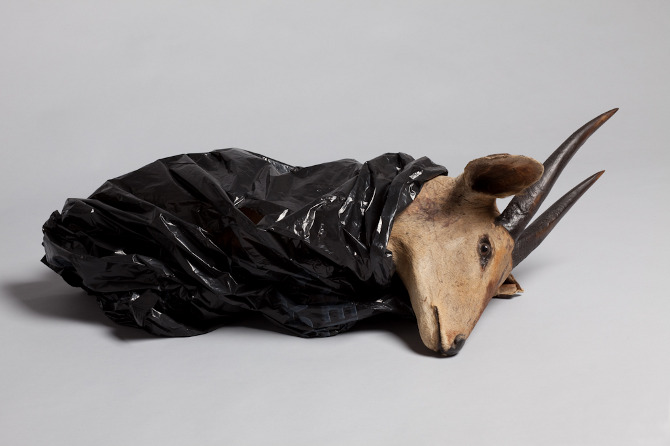 Reification I, III and IV (2015) consists of two large-scale framed photographs and an antelope’s head (taxidermy) presented by the artist in a black polythene bag. All three objects were originally brought from Uganda to the UK by Shah’s family. Here these objects are displayed as metaphors for experience lived and lost, and beyond their functional value, they become containers for memories or symbols of a colonial legacy. Shah reactivates these objects, reviving them from storage; some are photographed and some are presented as installations or ‘readymade’ sculptures, highlighting their materiality and form.