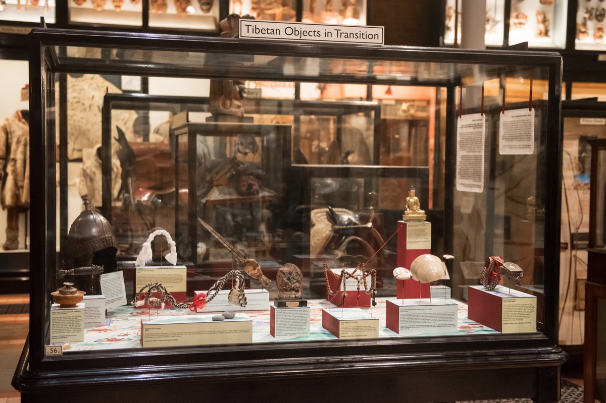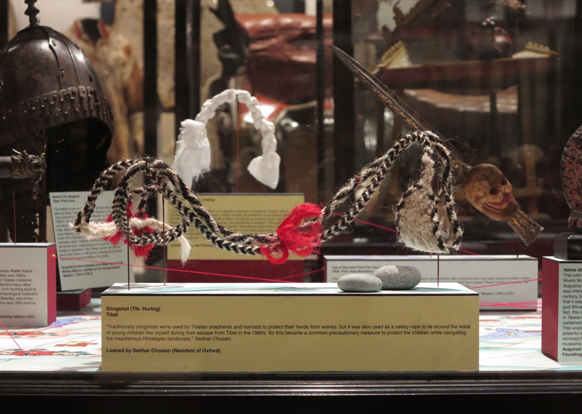 This case display is an experiment in creating a ‘Tibetan’ mode of displaying material culture which emphasises contemporary Tibetan voices, narratives and perspectives. Drawing from the Pitt Rivers Museum’s collections, as well as objects loaned by members of the Tibetan community in the UK, it is underpinned by the idea of transition, in terms of the material culture and people of Tibet. Like some Tibetan people, Tibetan objects have been ‘displaced’ from their original settings and acquired new meanings over the course of their journeys. Here, these displaced objects and narratives have been reunited with Tibet, personified through the figure of Senmo.