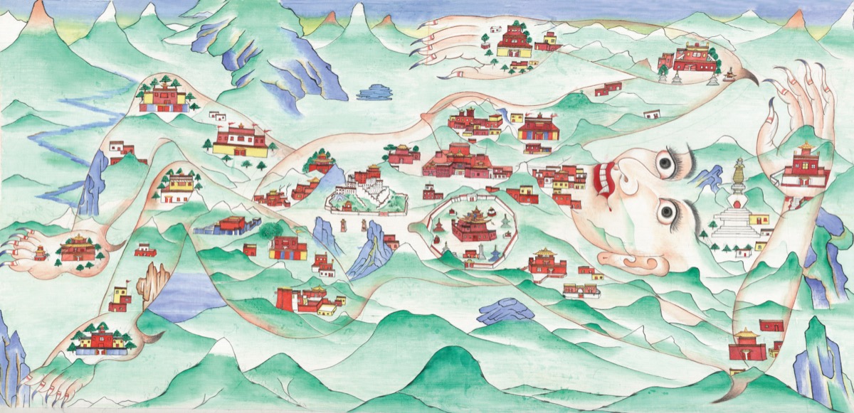 The image underpinning this display depicts the Senmo – a traditional female representation of the Tibetan landscape. She is depicted pinned down by Buddhist temples at thirteen key locations on her body: four in the inner realm (shoulders and hips), four at the border areas (knees and elbows), four at the borders beyond (hands and feet), and one at the centre (heart). For Tibetans, this geomantic map symbolizes the superimposition of Buddhism over the demoness’s power. The image also relates to shifts in Tibetan political organisation, from a loose tribal confederacy to a large and sophisticated empire that spread into Central Asia during the Yarlung Dynasty in the seventh to ninth centuries CE.