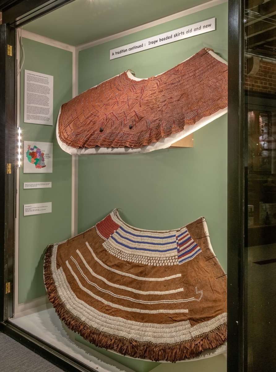 The skirts were made by young girls as part of the Iraqw women’s initiation ritual known as Marmo. Through participation in Marmo, Iraqw girls transitioned from puberty to womanhood. During the ceremony, girls were secluded from the wider community for up to a year, being cared for by the elder women. The girls were taught songs and word games, as well as sexual manners. They also embroidered the leather capes, with which they had entered seclusion, with their own individual beadwork designs, thus turning them into elaborately decorated skirts like the ones on display that demonstrated their skill and dexterity. The girls were also circumcised. For the Iraqw, circumcision was a rite of purification, performed so that when the girls emerged from seclusion – wearing their colourful skirts – they were considered to be reborn with a new innocence and dignity, ready for married life.
