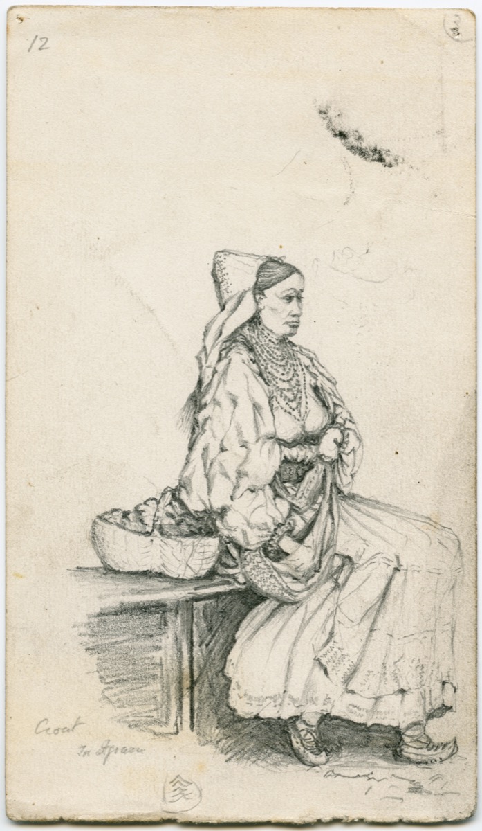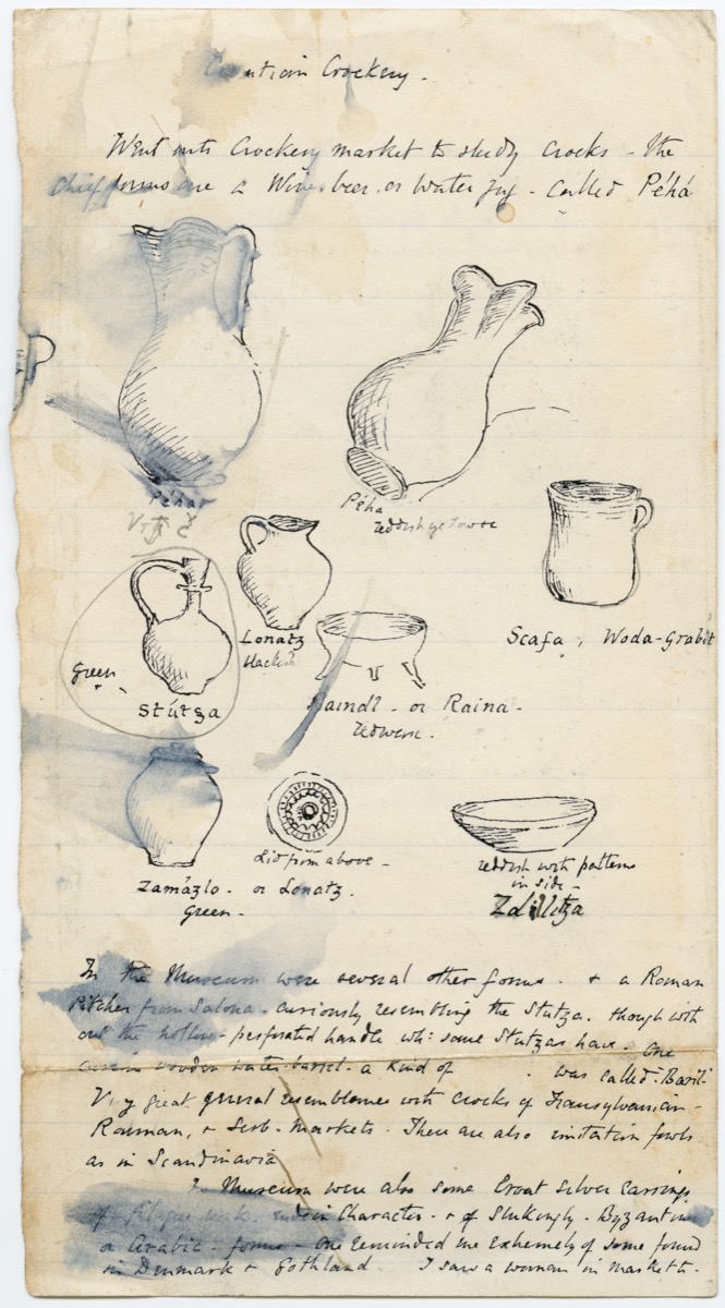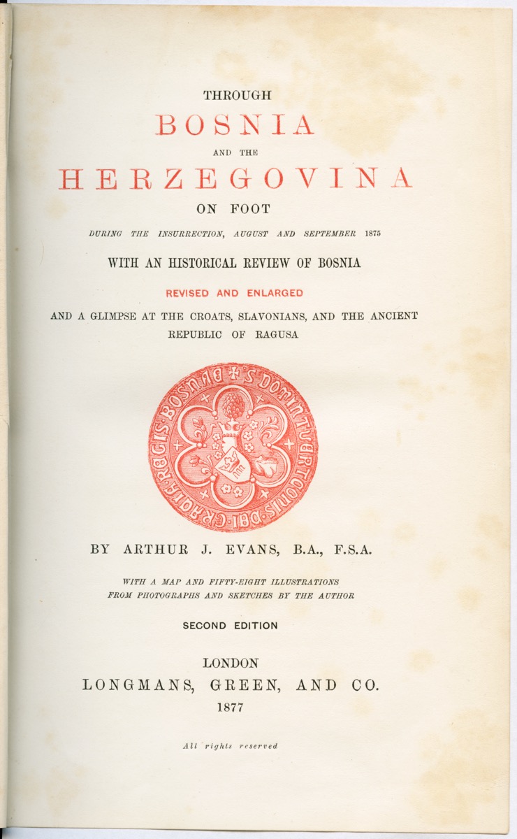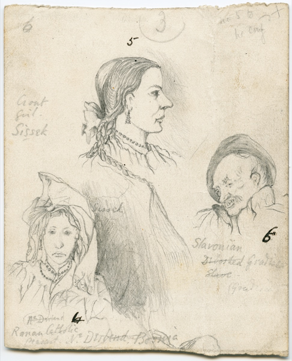 Also highlighted are various drawings and ink sketches made by Arthur Evans while travelling with his brother through Bosnia and Herzegovina in 1875. These show places and people encountered on a route south from Agram (present-day Zagreb) – via Tešanj, Sarajevo and Mostar – to Ragusa (Dubrovnik), traversing a region which at the time was suffering considerable unrest. The illustrations demonstrate a particular interest in physiognomy and dress, Evans writing concurrently, for example, of Turks, of Southern Slavs and the ‘beauty of the Croatian peasant costume’. Undertaken primarily as an aide-mémoire, the drawings subsequently provided the basis for engravings published in his account of the journey, Through Bosnia and the Herzegóvina on Foot during the Insurrection, August and September 1875 (1876), whose success brought about a second edition, exhibited here, the following year.