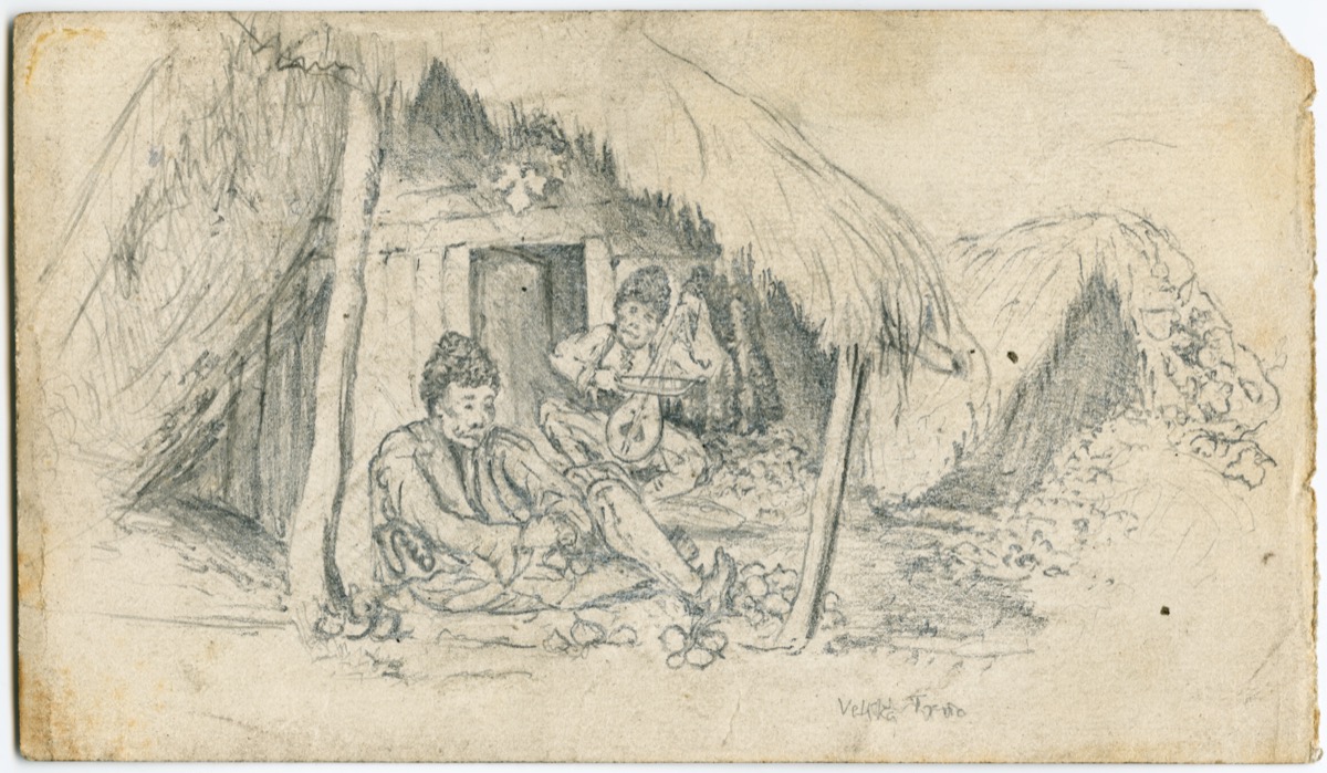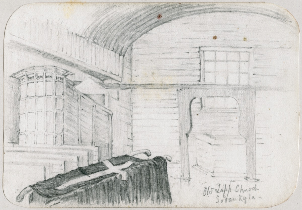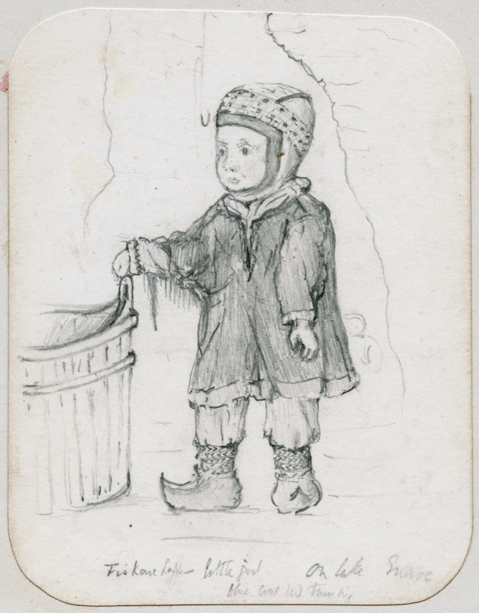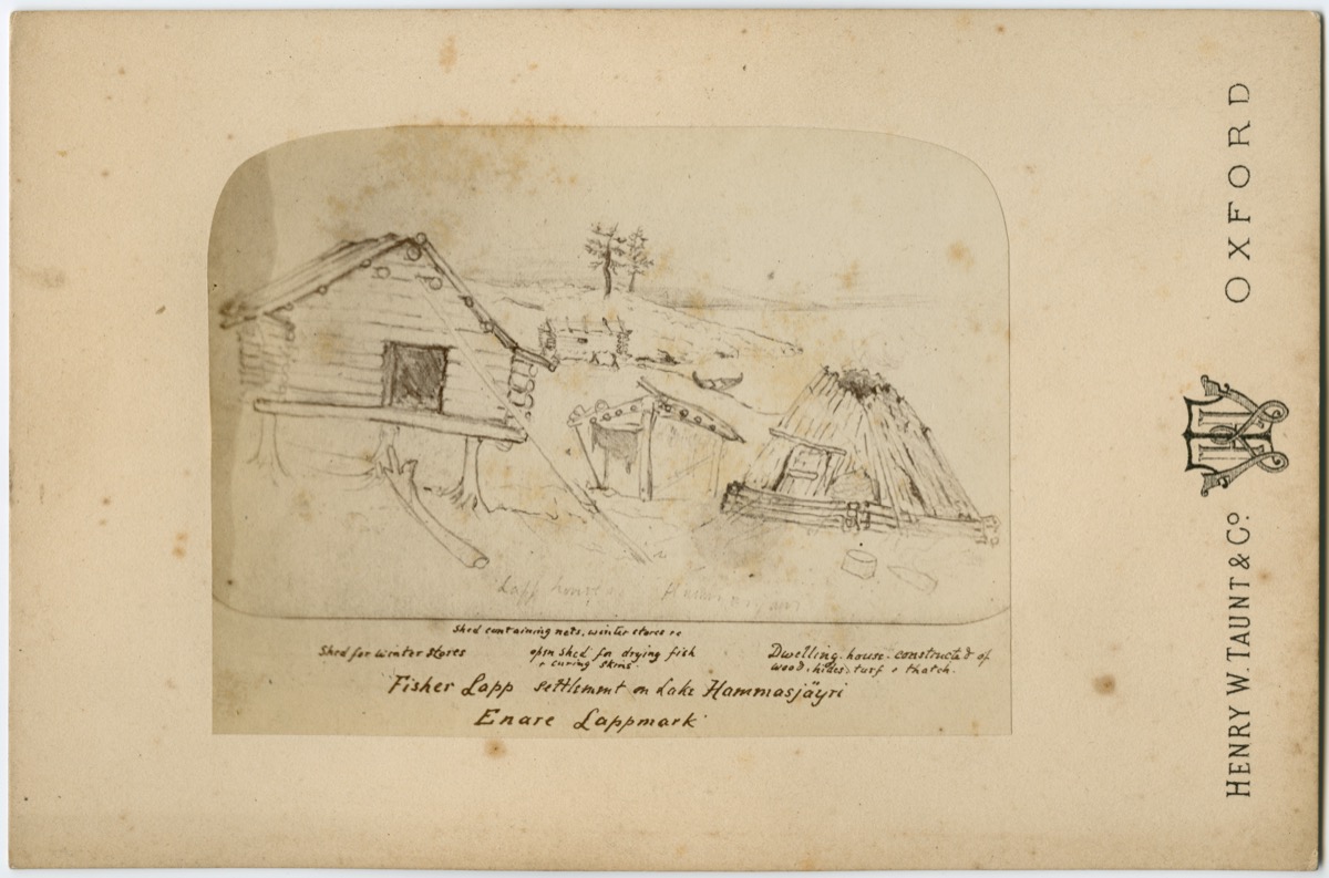 This case display presents a selection of twenty-three drawings, sketches and photographs by the archaeologist Sir Arthur J. Evans (1851–1941). Probably best known for excavating the ancient site of Knossos in Crete, Arthur Evans was encouraged in his education by his father and travelled widely as a young man. Among his earliest adventures, made while still an undergraduate at Oxford, was a trip to Finnish Lapland with two friends in the summer of 1873. Setting off from England in early August, the party sailed along the Swedish coast as far as Tornio on the border with Finland, there transferring to an overland route and working their way northwards, on foot and by canoe, to Lake Inari in the Arctic Circle. Hiring local guides to pole their vessels up the rapids, the three Englishmen experienced ‘a country of tame reindeer’, as Evans recorded it in his journal, and ‘a people who evidently love ornament and colour’. The photographs taken by Evans, and more particularly his lively drawings of the Finnish and Saami settlements where they stayed, exhibit the wide-eyed excitement of youth and provide a visual narrative of the journey. Evans returned home with memories and some objects, and an interest in northern peoples, but never again put to paper anything more on the remarkable voyage.