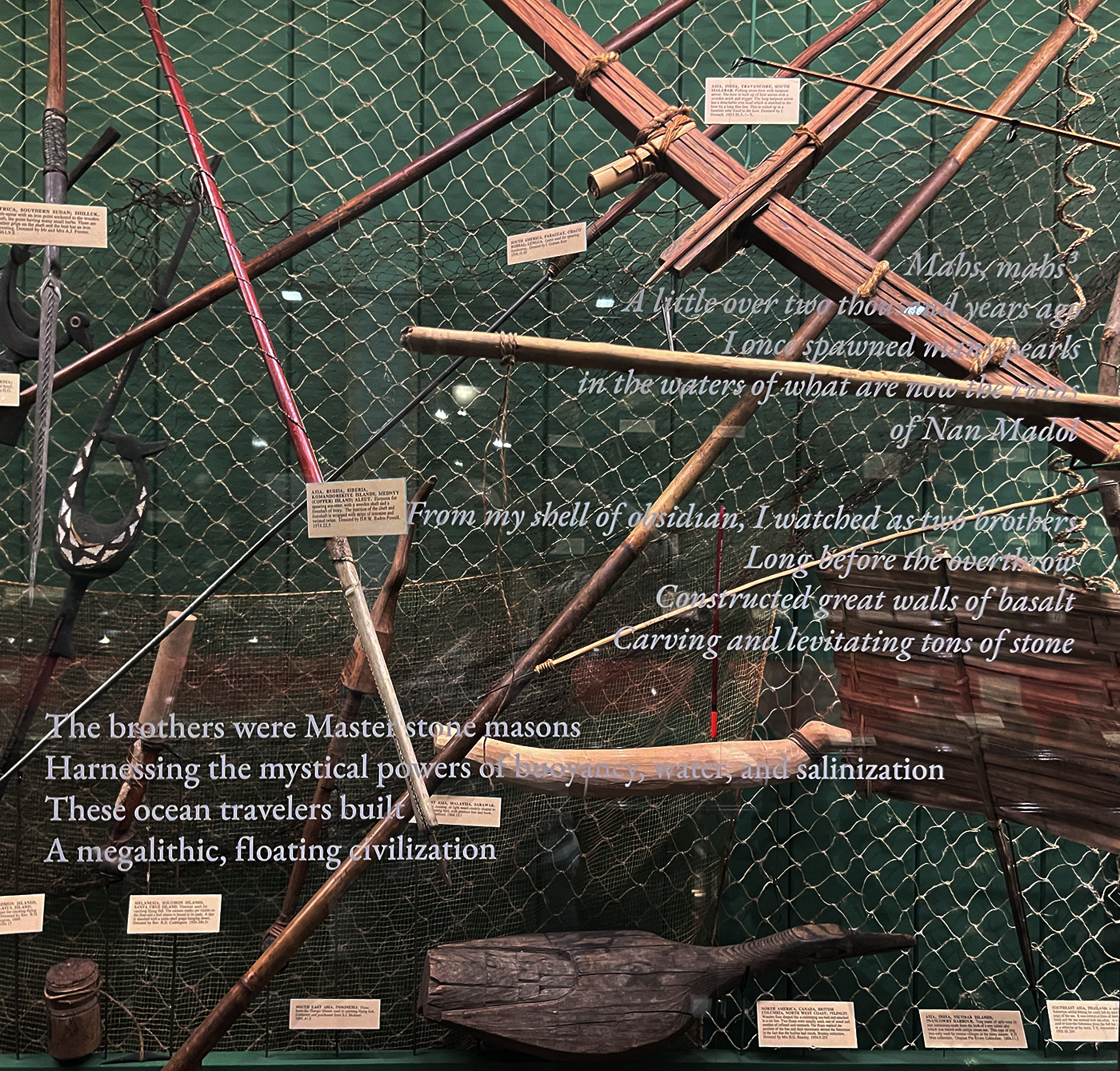 Unfinished was commissioned by Marenka Thompson-Odlum, as part of the Digital Engagement & Innovation project. It exists both as written ‘concrete’ poetry and as a recorded spoken word piece. Unfinished is written from the perspective of the 31 pearl shell tools that the museum has described as ‘unfinished shell shanks of a fishing hook’ which were taken from the King’s tomb at the archaeological site of Nan Madol on Pohnpei. Nan Madol is a series of more than 100 islets off the south-east coast of Pohnpei that were constructed with walls of basalt and coral boulders. These islets harbour the remains of stone palaces, temples, tombs and residential domains built between 1100 and 1500 CE. These ruins represent the ceremonial centre of the Saudeleur dynasty, a vibrant period in Pacific Island culture. The huge scale of the edifices, their technical sophistication and the concentration of megalithic structures bear testimony to complex social and religious practices of the island societies of the period.