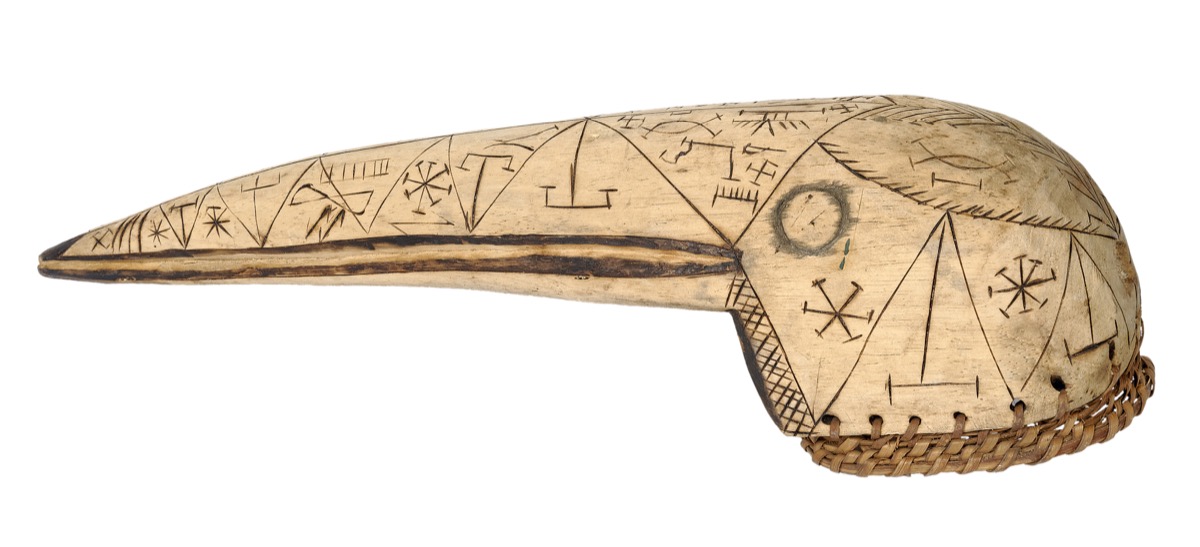 The Ejagham (also known as 'Ekoi') people of southeastern Nigeria used objects like this bird-beaked headdress as props in ceremonial plays. It has been pyro-engraved with nsibidi, a centuries-old ideographic script used by secret societies. Pyrography or pyro-engraving is the art of decorating wood or other materials using a heated tool or a fine flame. The term means 'writing with fire', from the Greek pur (fire) and graphos (writing).