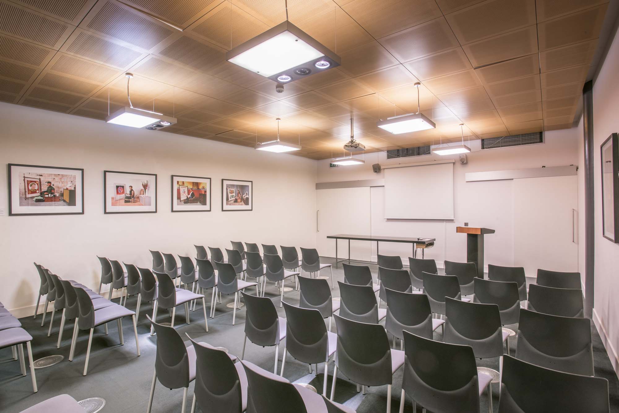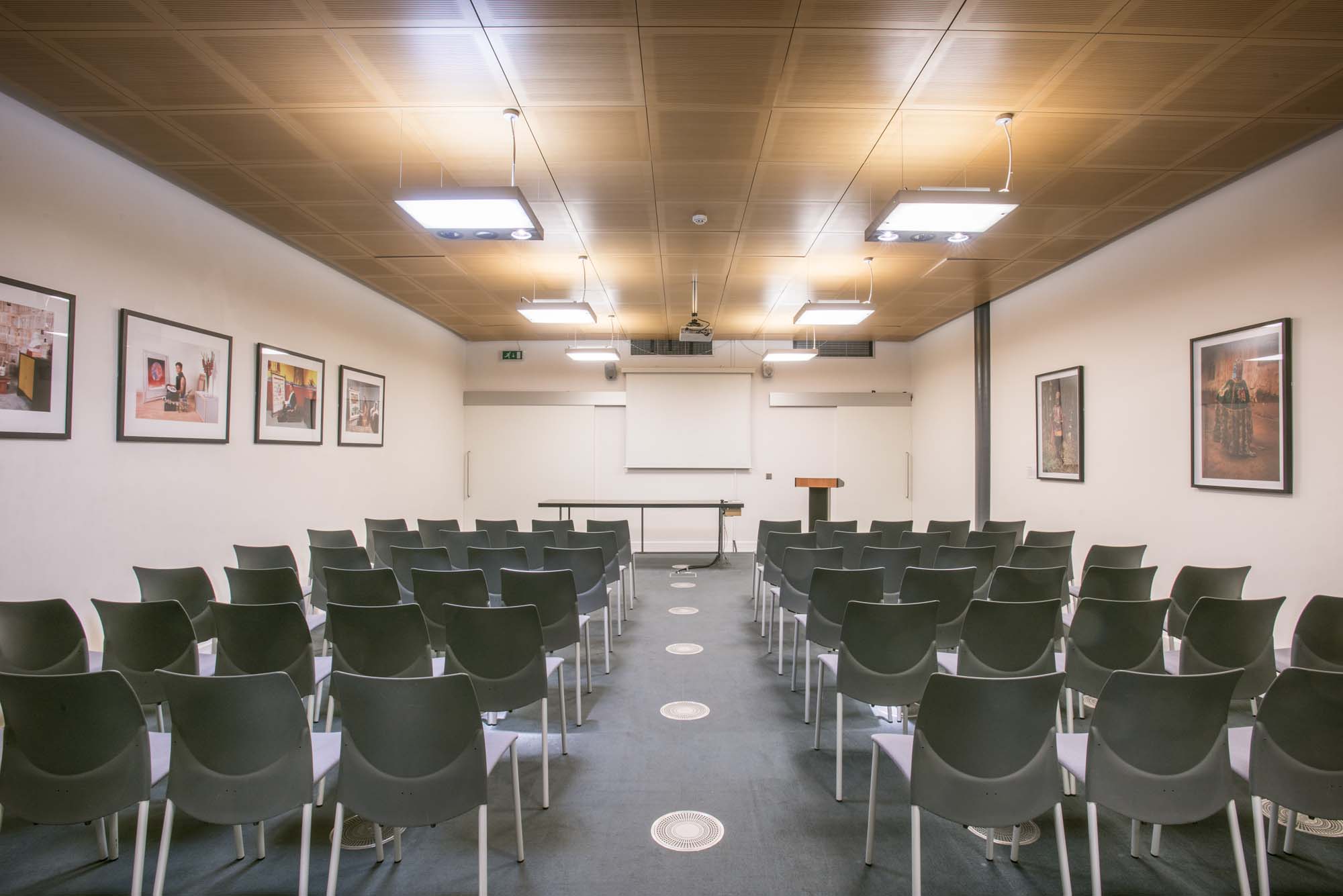 Modern flat-floored lecture room, perfect for medium-sized lectures. Facilities include full AV (screen, projector, laptop), free WiFi and full accessibility for visitors with additional needs.