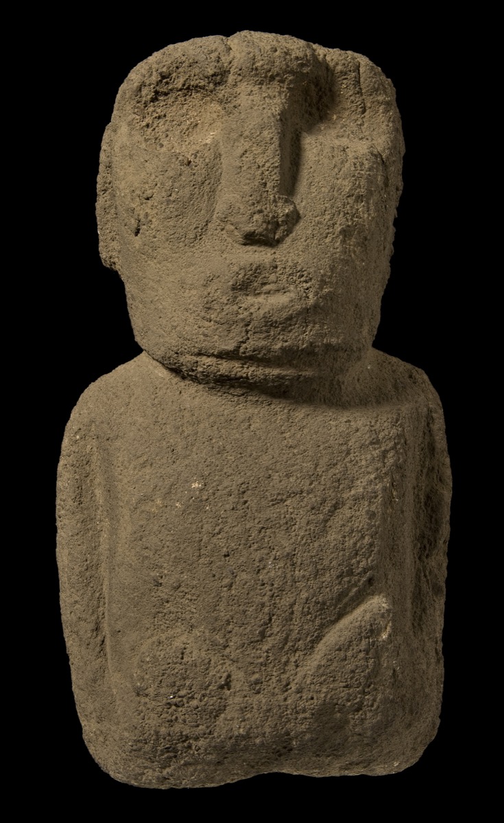 The quarry for nearly all the rock used for both the small figures and the monumental moai was Rano Raraku, an extinct volcano crater at the eastern end of the island. The compressed volcanic ash (called ‘tuff’) was relatively soft and easy to work, though one theory suggests that the huge number of wooden logs needed to mine and transport the stone led to the deforestation of the island.