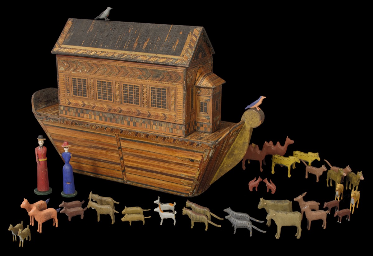 The Erzgebirge (Ore Mountains) region of eastern Germany has been renowned for its wooden toy industry since the 18th century. This Noah’s ark, dating to around 1860, is decorated with straw marquetry and is accompanied by wooden figures of birds and animals, along with Noah and his wife.