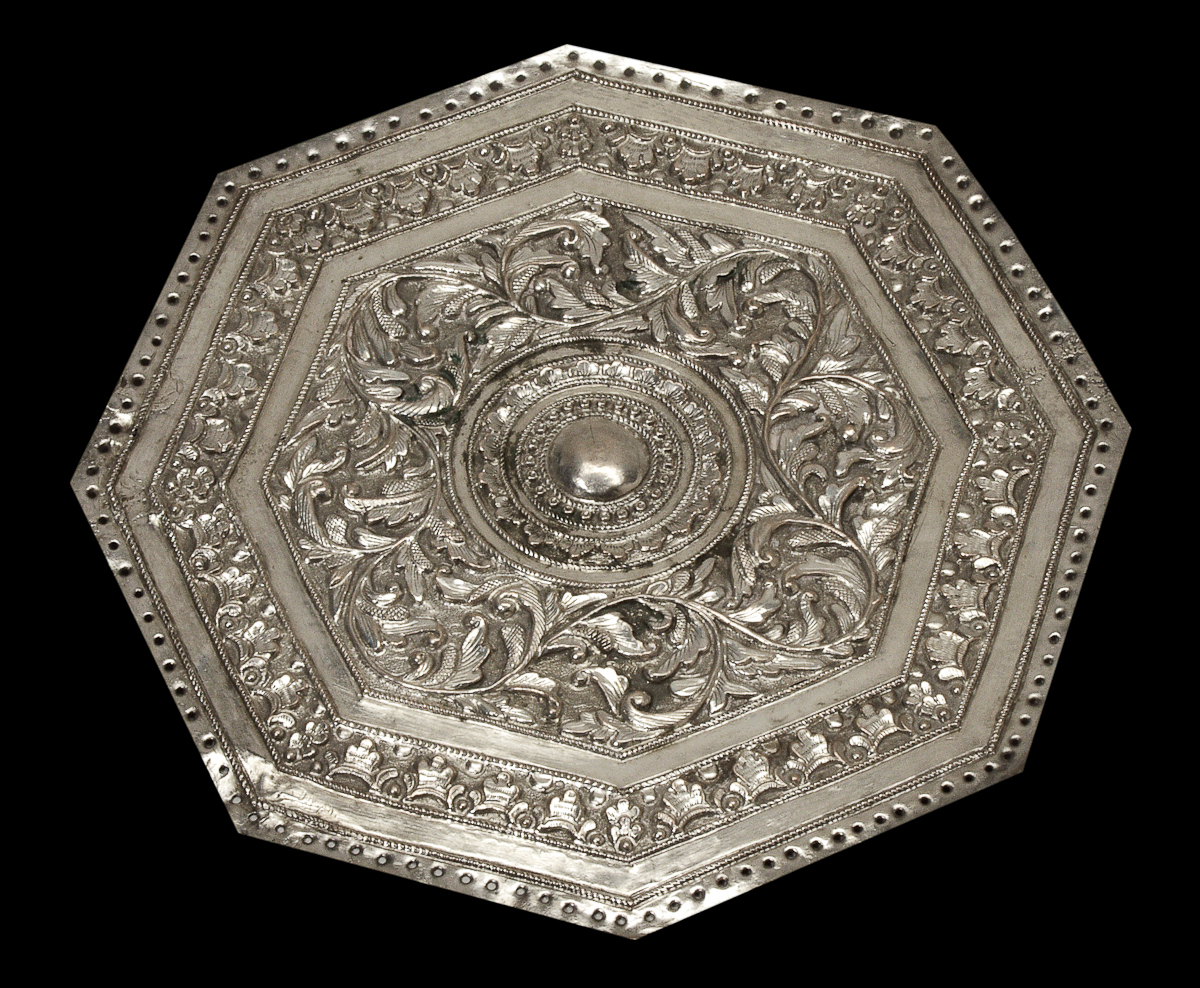 Silversmithing was a traditional court craft in the Malay region; it expanded due to European trade and a rich tin-mining industry in the late 19th century. Malay silverware shows a variety of techniques (chasing, repoussé, niello and electroplating), and sultans summoned the best craftsmen to melt down coins or ingots to craft into exquisite utensils and ornaments. In accordance with the precepts of Islam, the designs on octagonal or rectangular silver bantal comprised floral and foliate motifs in arabesque patterns.