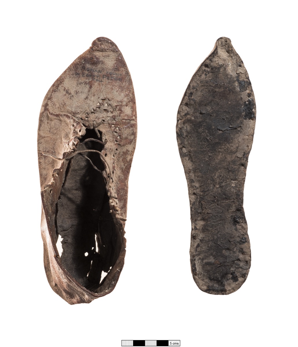 The shoes show evidence of red staining, suggesting they may have belonged to a high-status person, since the red kermes dye derived from insects from European oak trees was expensive. The wealthy owner would have worn these shoes outdoors, with wool or felt socks, but would have preferred open-toed sandals indoors.