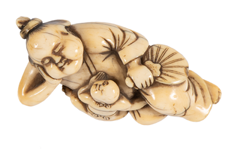Netsuke of a child climbing on a sleeping woman. Ivory, Japan (made before 1939). Donated to the Pitt Rivers Museum in 1980. PRM 1980.34.2566.