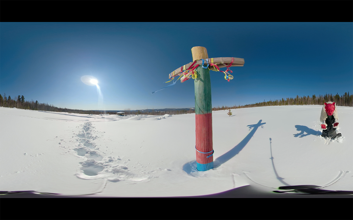 Two short films are included in a plinth in front of the display case. One of these shows 360 degree footage recorded by Anya Gleizer, documenting how immersive video and VR headsets have been used to digitally facilitate connections with the museum collections in Evenkia, and the bringing of Evenki perspectives into the museum. Some stills of the 360 video feature below. A 360 film VR experience has also been created by Anya Gleizer, which has featured as part of the display and at museum events.